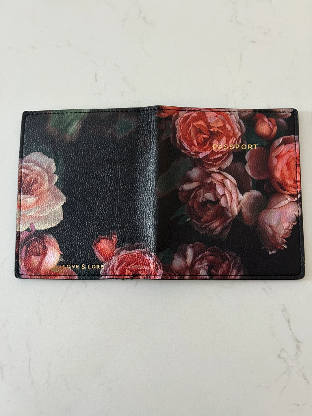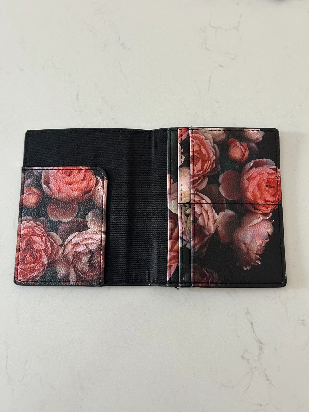 This passport holder features a beautiful floral print on a black background. It's made of faux leather and has slots for your passport and cards. Perfect for keeping your travel documents organized!
