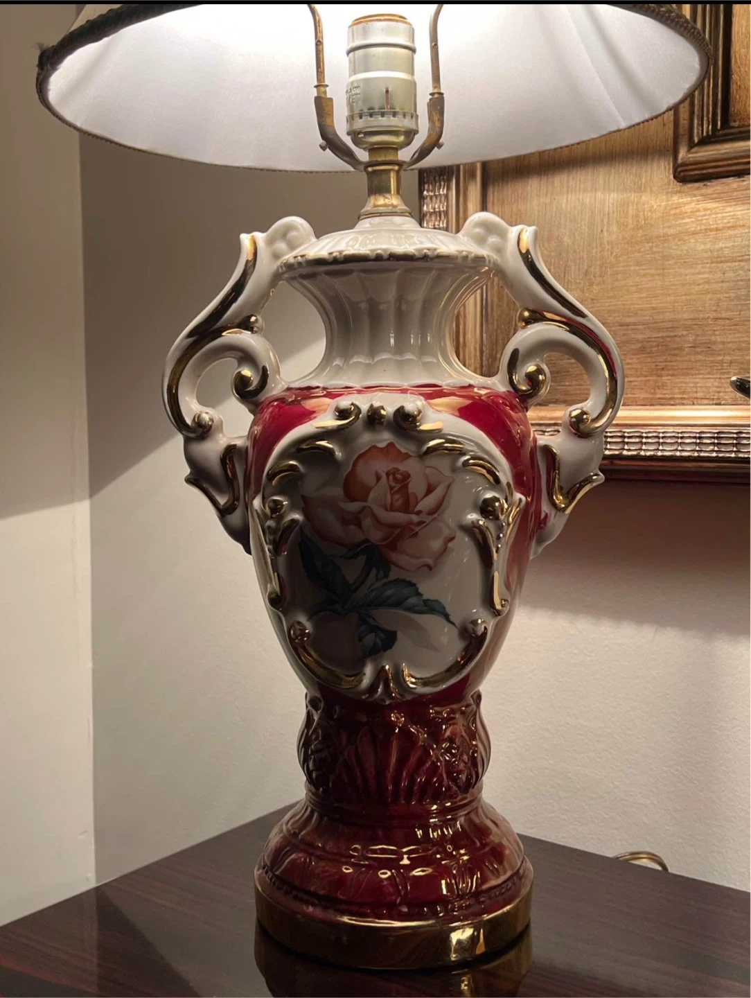 Beautiful vintage ceramic table lamp featuring a decorative rose motif. It's a stunning piece for any living room or bedroom. This lamp has a classic urn shape with ornate gold accents.