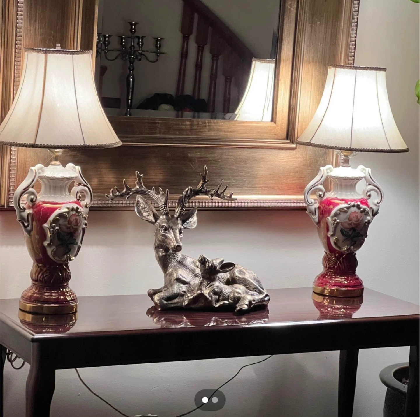 Beautiful vintage ceramic table lamp featuring a decorative rose motif. It's a stunning piece for any living room or bedroom. This lamp has a classic urn shape with ornate gold accents.