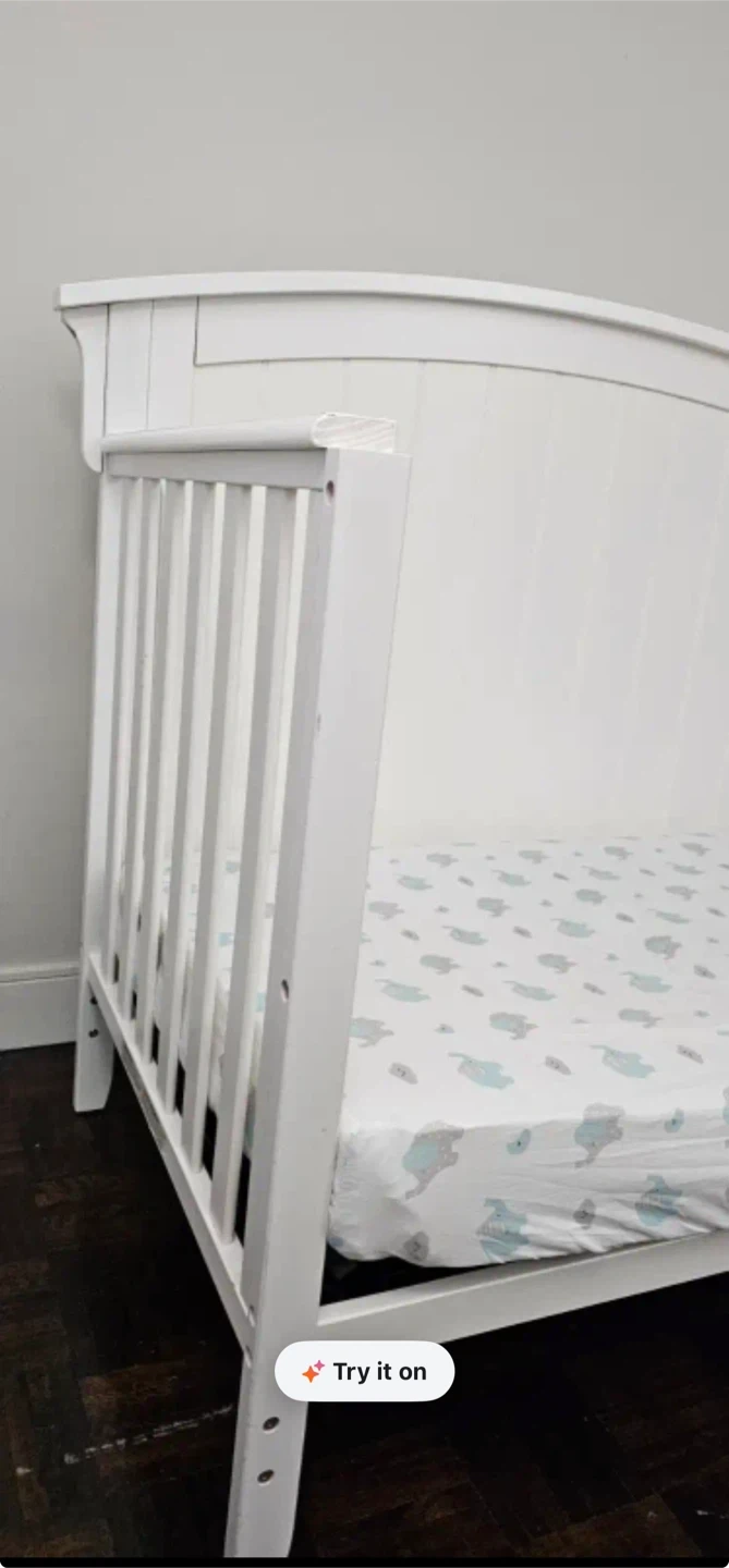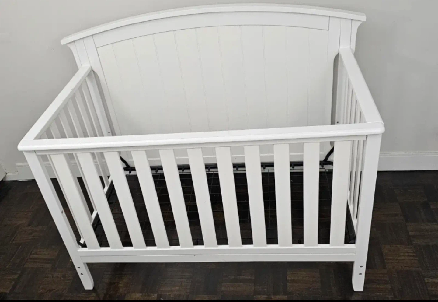A classic crib in a clean white finish. Features slatted sides and headboard design. Complete with a metal support frame. Can be a perfect spot for baby's naps.