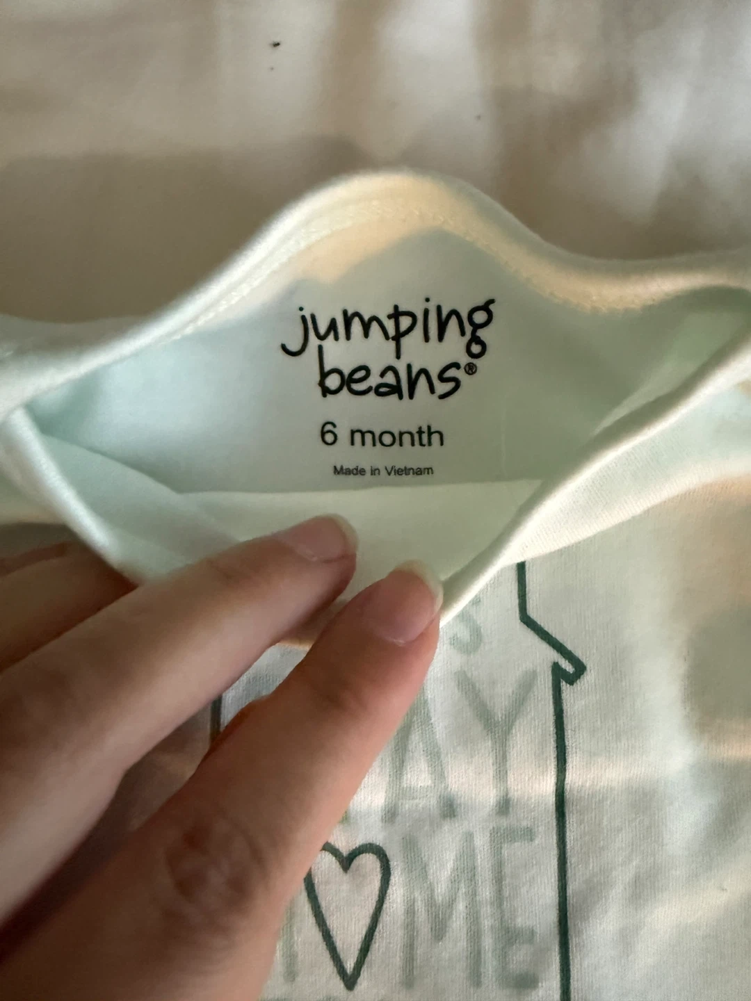 This is a Jumping Beans long-sleeve baby bodysuit. It's a size 6 months. The bodysuit is light green and features a "Let's Stay Home Today" graphic.