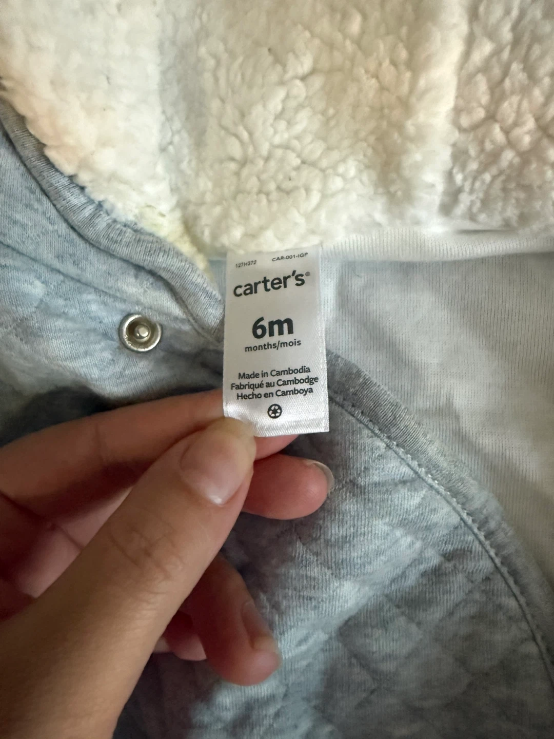 Carter's gray quilted snowsuit bunting for babies. It's fleece-lined with a hood for extra warmth. Size is 6 months. Made in Cambodia.