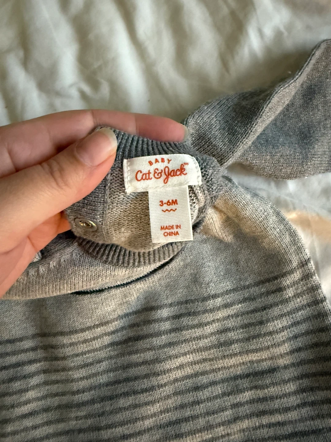 Cozy gray knit romper from Cat & Jack with a cute bear face design. Features contrast stripes and snap closures for easy dressing. Size is 3-6 months.