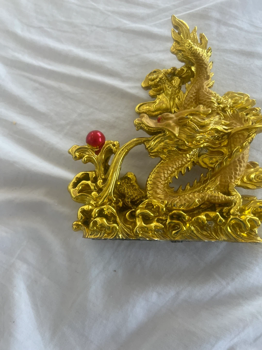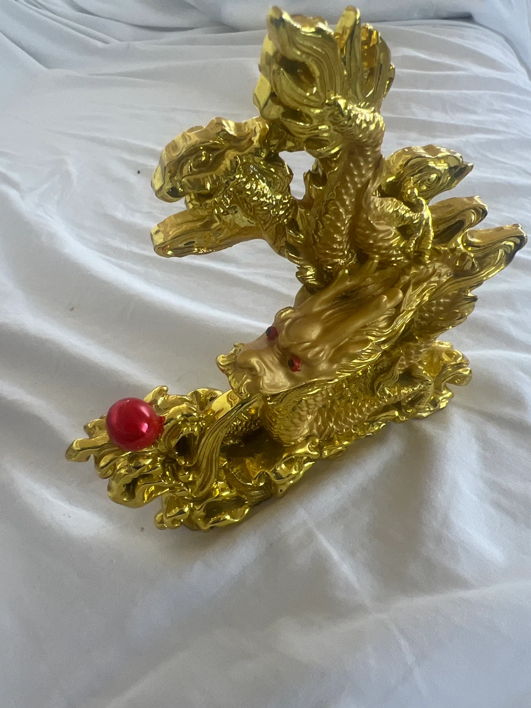 This ornate gold-coloured dragon statue features intricate detailing and two heads. It's accented with a bright red orb held by the dragon. This decorative piece would make a statement in any space.