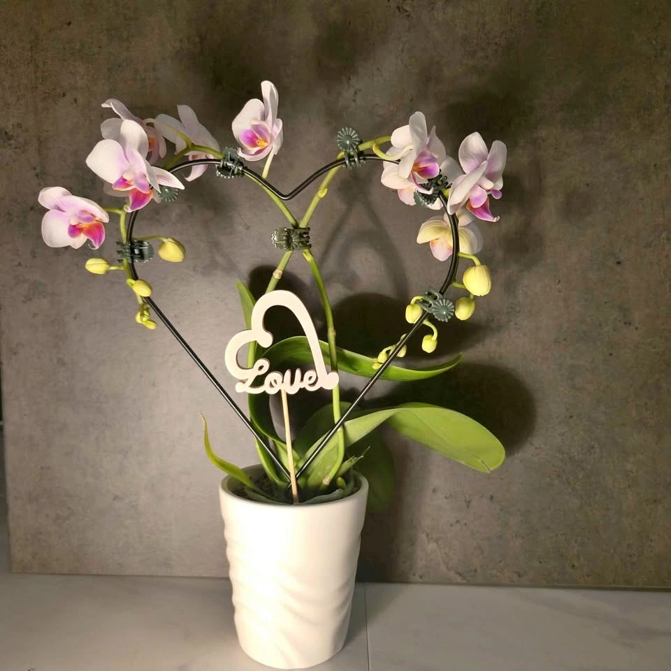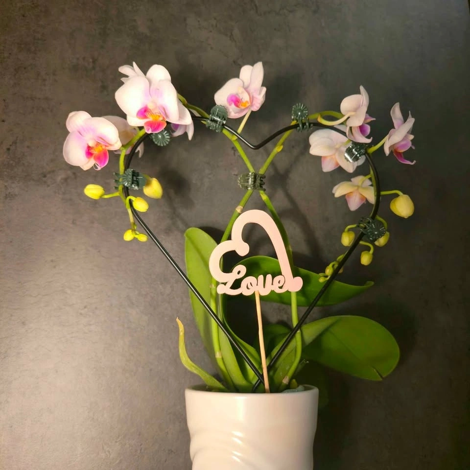 Pinkish white real orchids in a heart shape. 1.0' height, 1.0' wide. In a 4" pot covered with a white ceramic pot cover. The 'Love' sign is also removable. FREE LOCAL DELIVERY/ PICK-UP.
