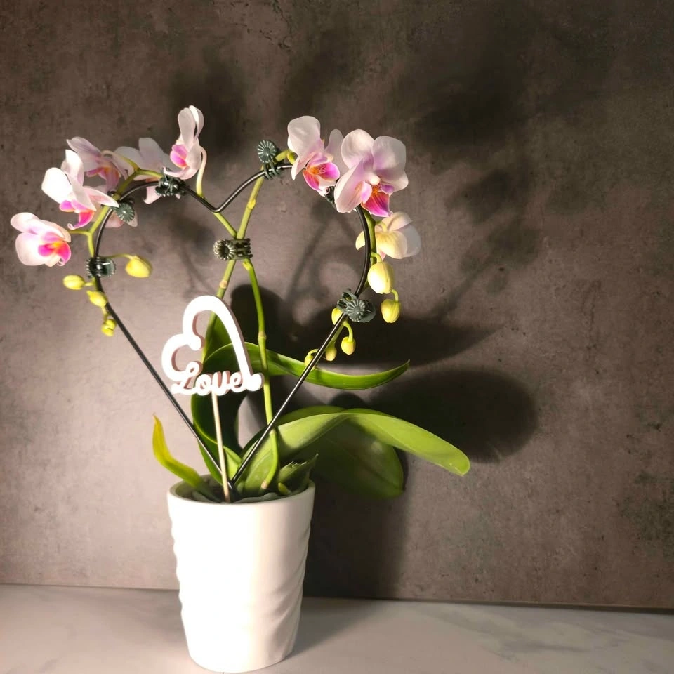 Pinkish white real orchids in a heart shape. 1.0' height, 1.0' wide. In a 4" pot covered with a white ceramic pot cover. The 'Love' sign is also removable. FREE LOCAL DELIVERY/ PICK-UP.