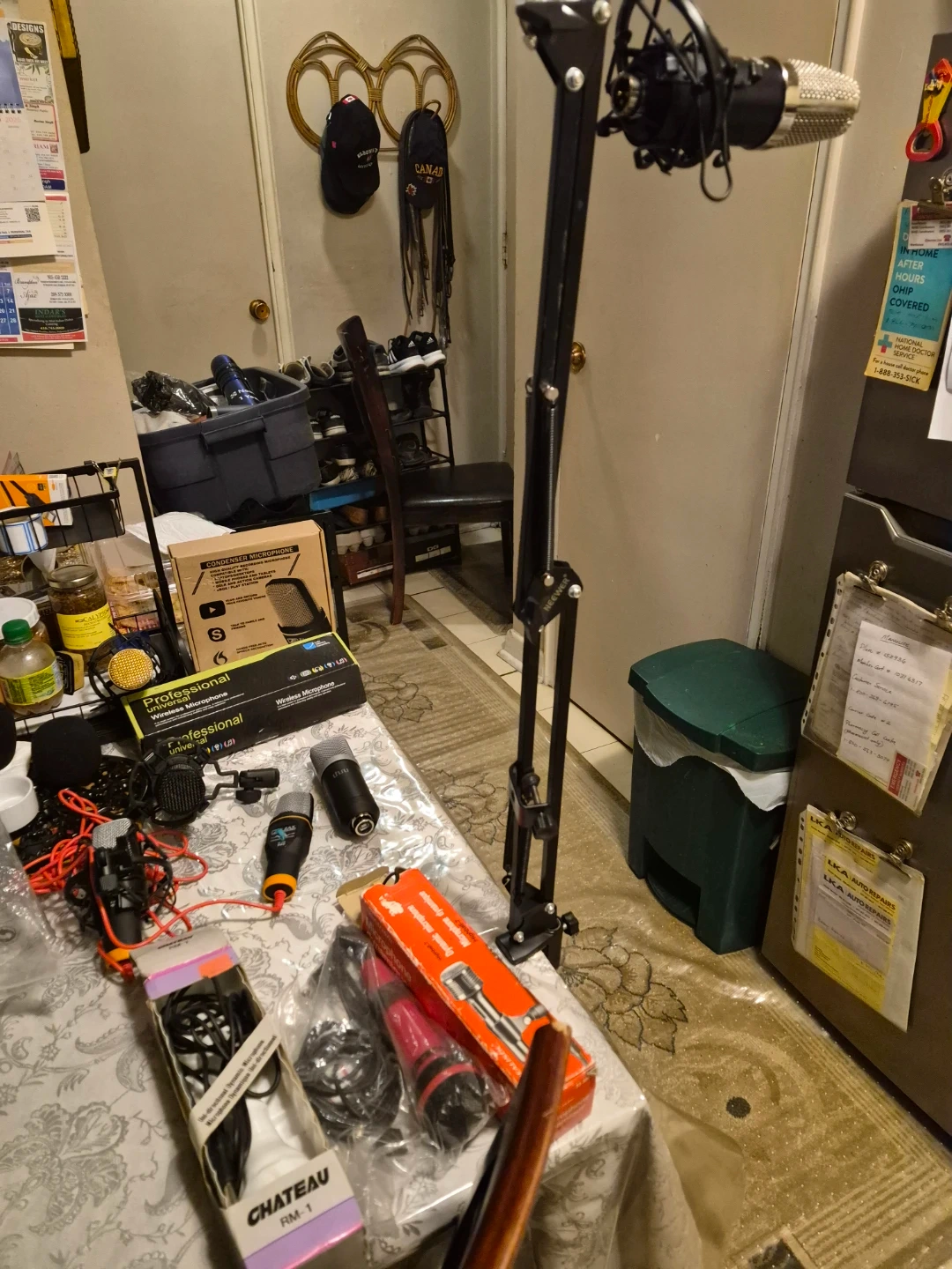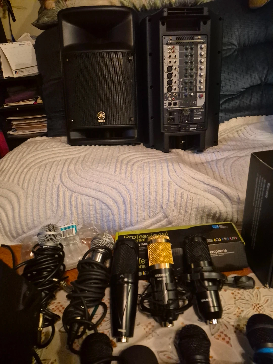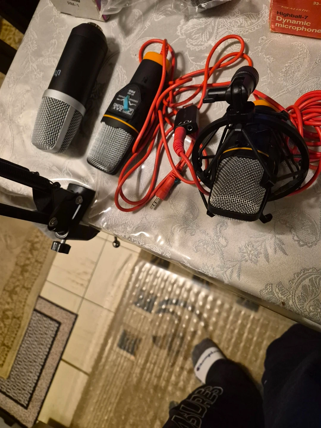 A collection of various microphones, including condenser and dynamic types, along with mounts and cables. This lot features brands like Neewer and Band Professional Microphones. It's a great assortment for aspiring podcasters or home studio setups!