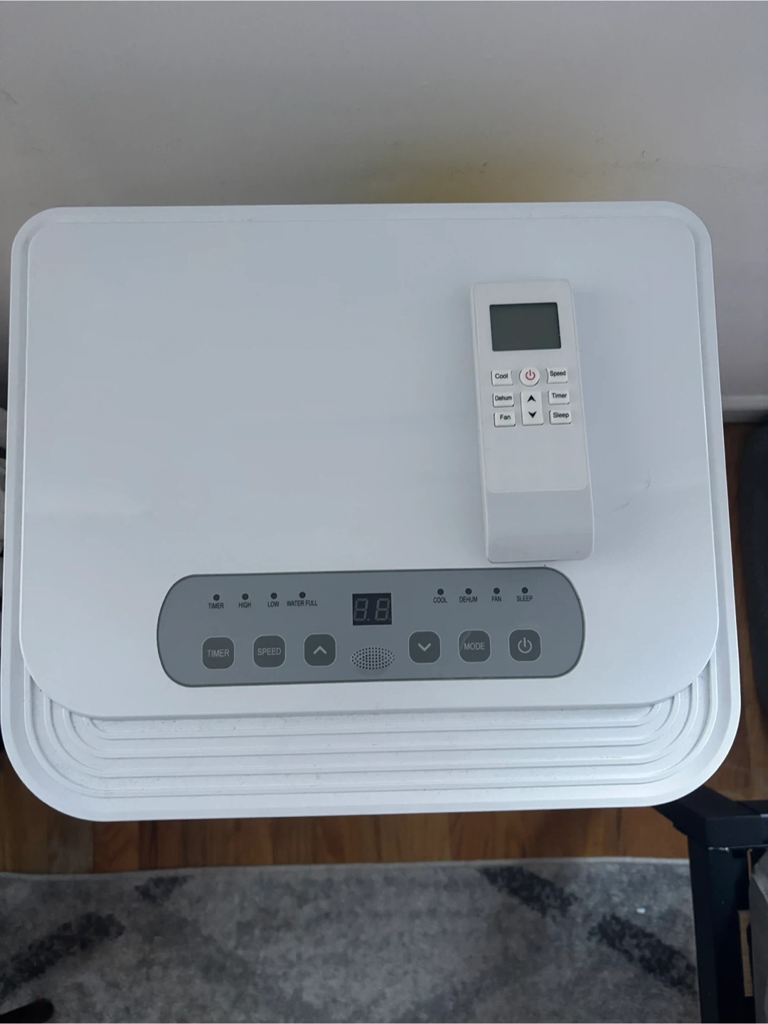 This is a compact and portable air conditioner with a remote control. The unit has multiple settings for cooling, humidifier and fan speed. It also features a timer and sleep/quiet mode. Quick installation with all-inclusive window kit. It's great for keeping a room cool.