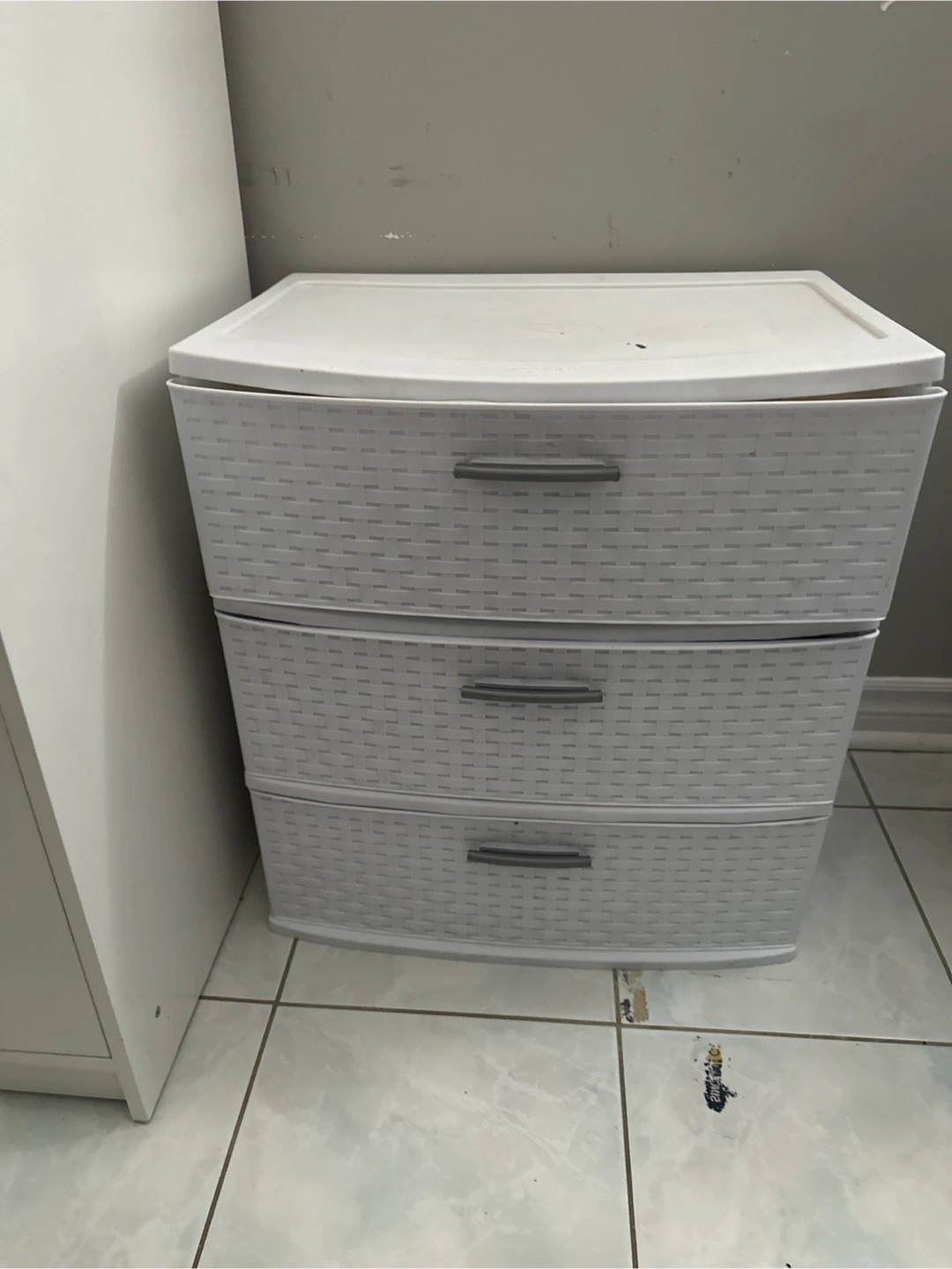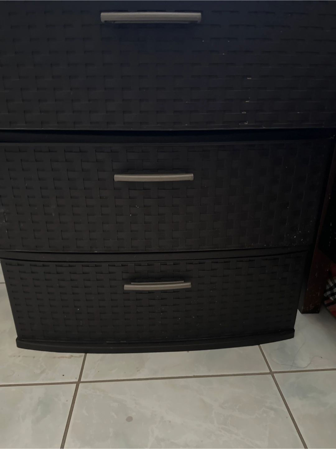 This is a black plastic storage unit with three drawers. It's great for organizing clothes or other household items. The drawers have easy-pull handles. This unit's woven texture adds a nice touch.