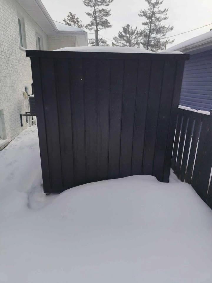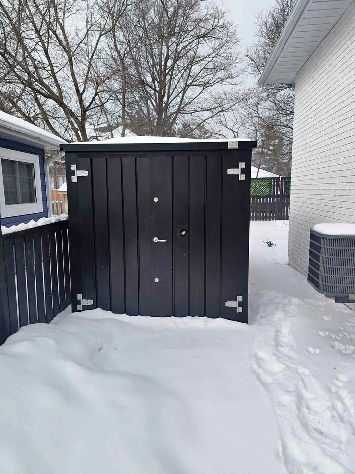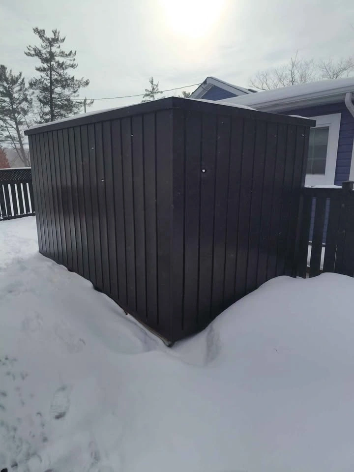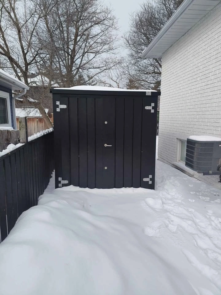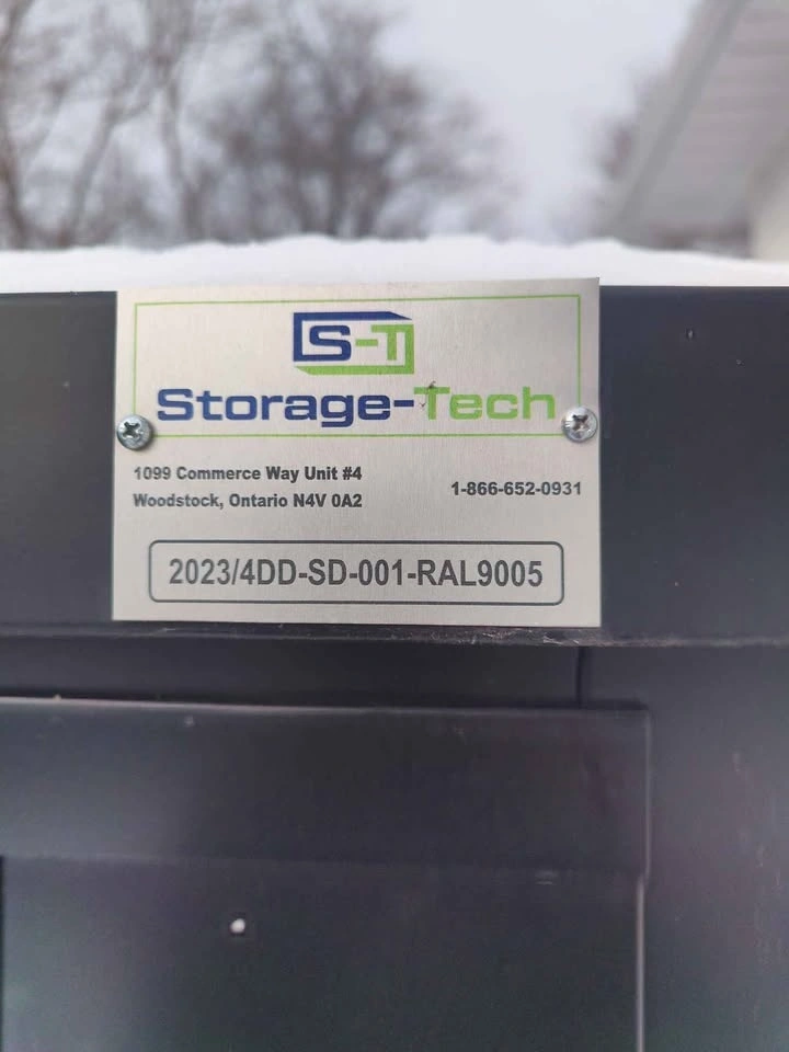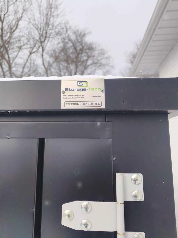 Selling the M-Series container from Storage Tech in black. It features a sleek, modern aesthetic with tighter corrugated steel walls. This is a 13'x7'x7' container. Assembly is simplified with a quick bolt-together system. It's suitable for residential or commercial use.
