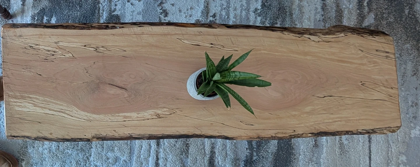 This live edge wood coffee table has a unique natural wood grain and a smooth finish. It's supported by sturdy metal legs. It's a real statement piece for your living room!