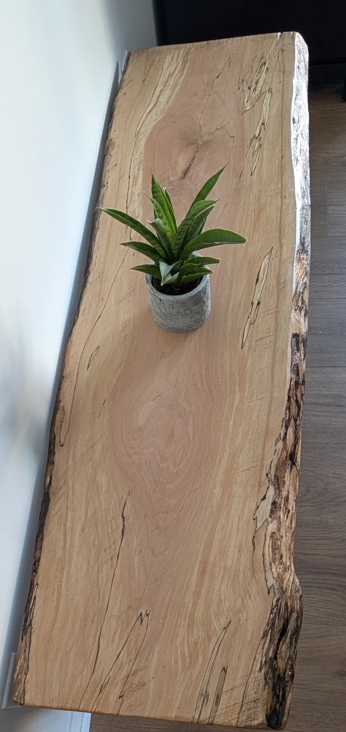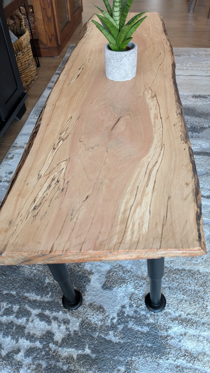 This live edge wood coffee table has a unique natural wood grain and a smooth finish. It's supported by sturdy metal legs. It's a real statement piece for your living room!