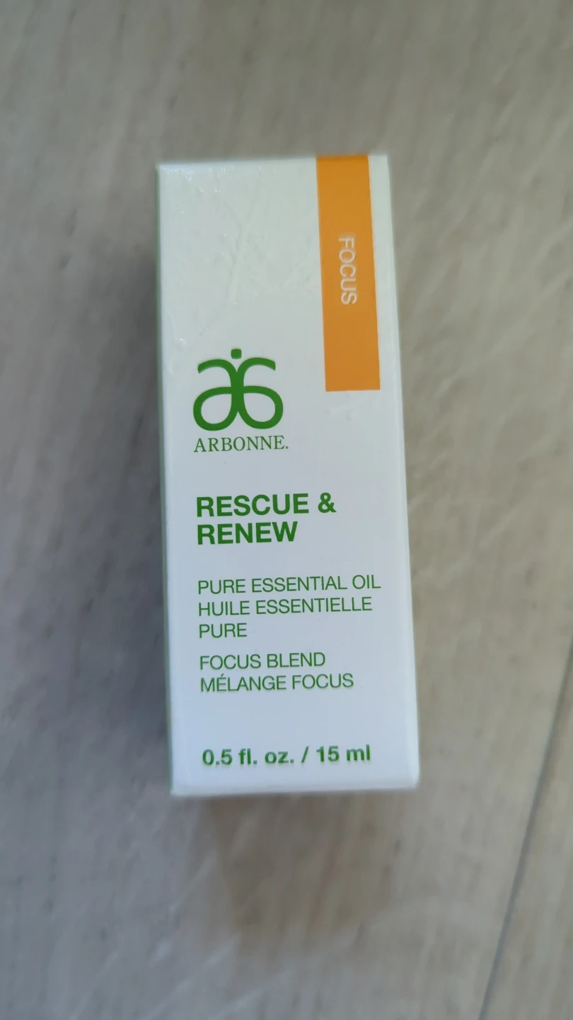 Arbonne Rescue & Renew Pure Essential Oil in a Focus Blend. It's 15 ml. Ingredients include Basil Oil, Peppermint Oil, Bergamot Oil, Lemon Oil, Citral , etc