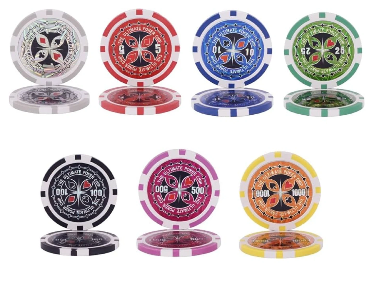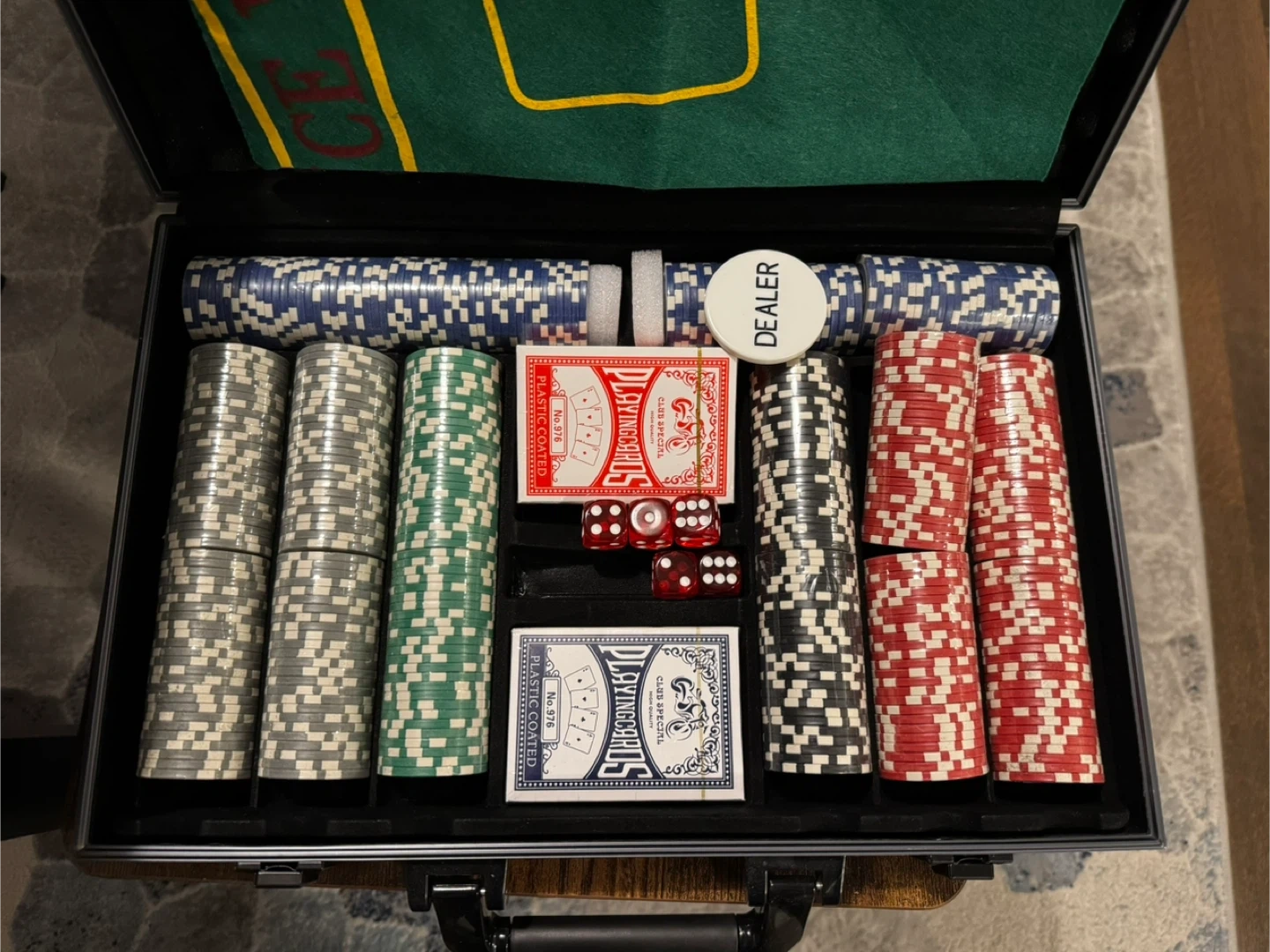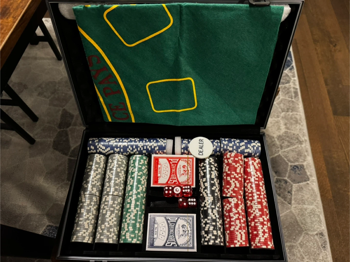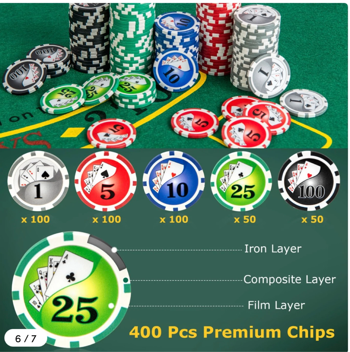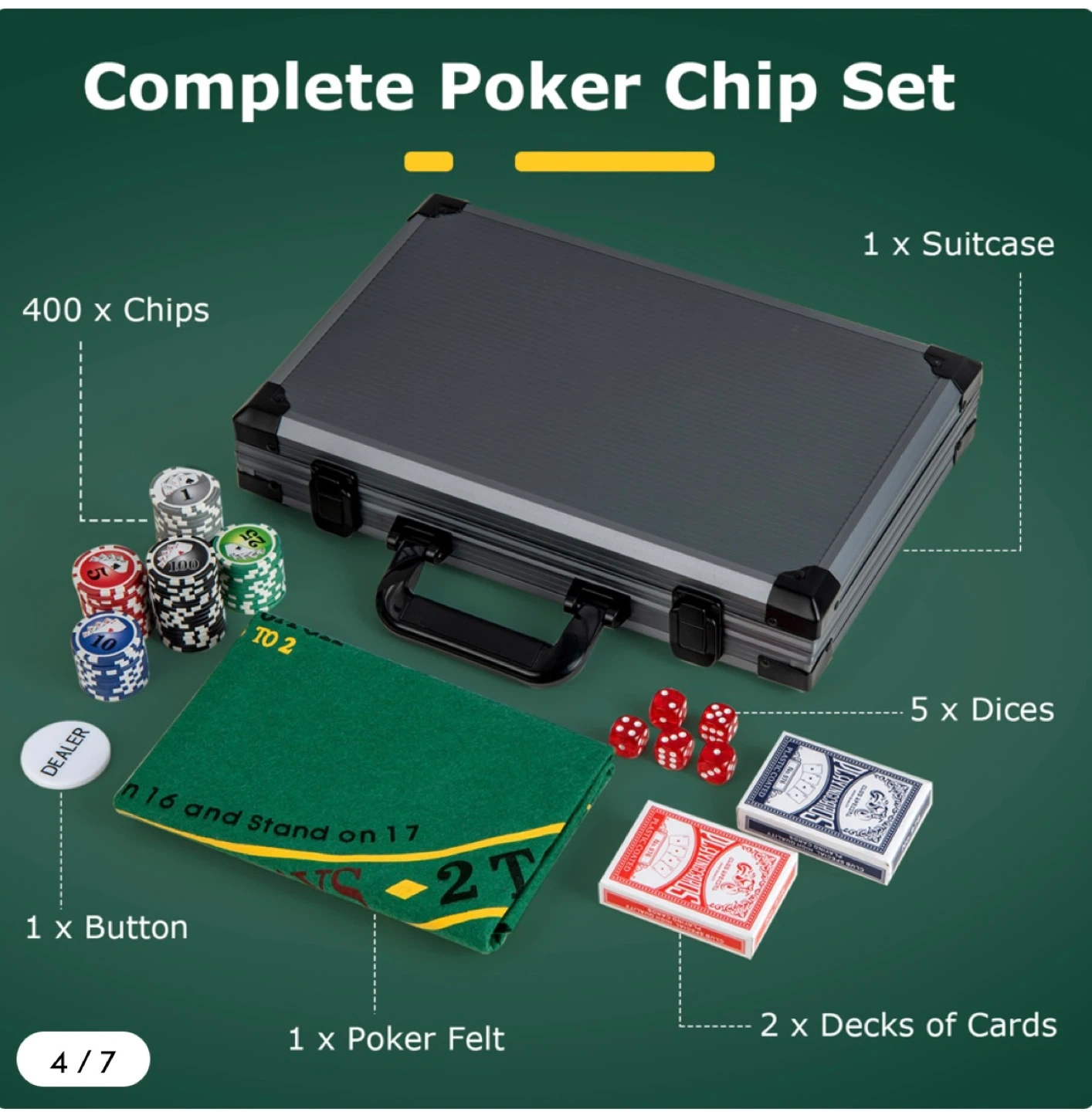 This is a complete poker chip set that includes 400 premium chips. It comes with a durable suitcase for easy storage and transport. The set also includes two decks of cards, five dice, a dealer button, and a poker felt mat. It's perfect for game nights with friends and family!