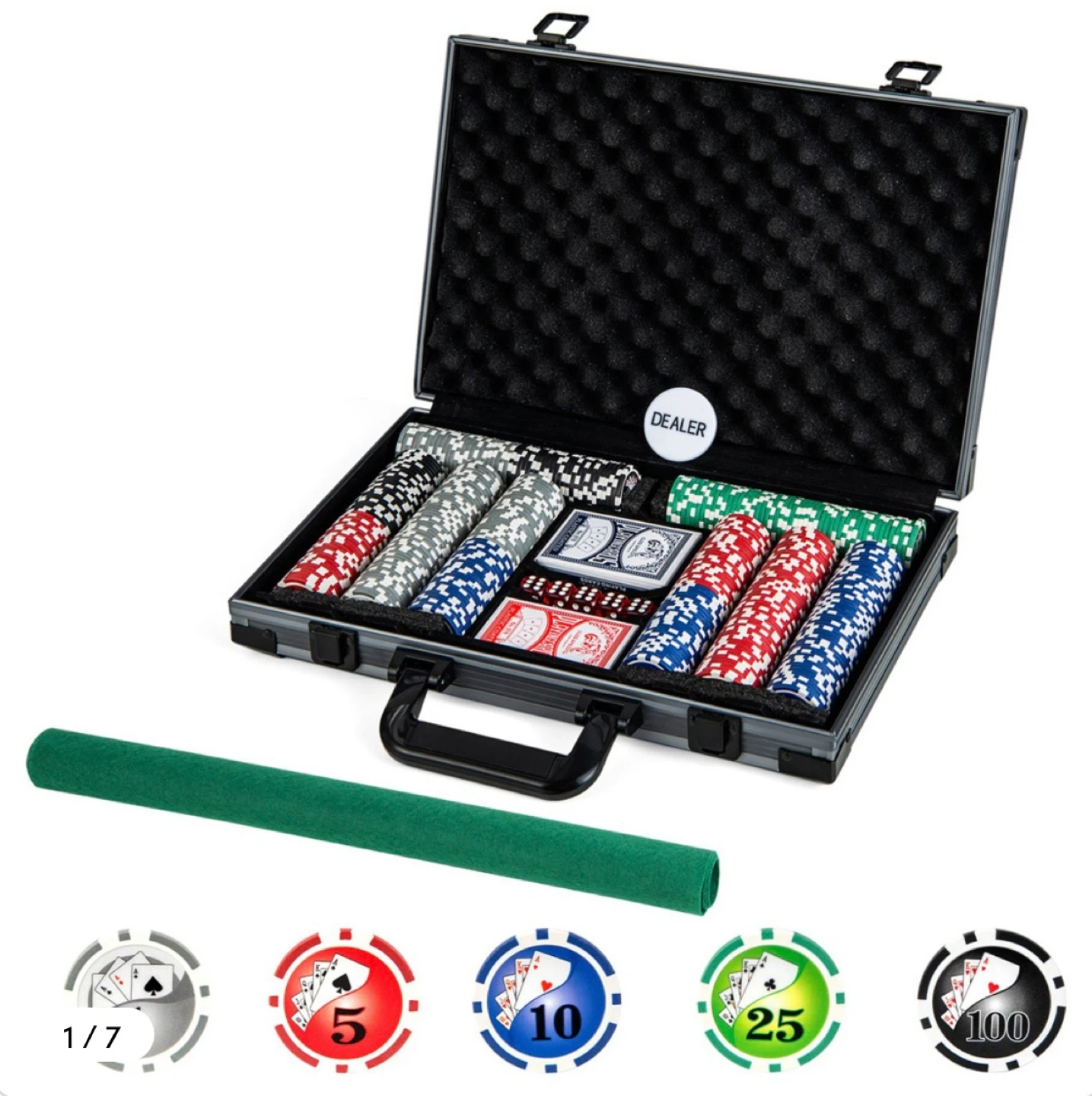 This is a complete poker chip set that includes 400 premium chips. It comes with a durable suitcase for easy storage and transport. The set also includes two decks of cards, five dice, a dealer button, and a poker felt mat. It's perfect for game nights with friends and family!