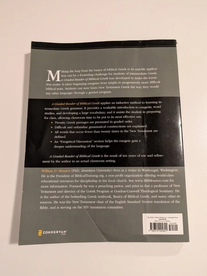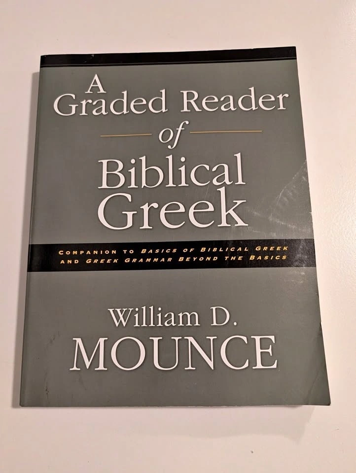 For sale is a copy of "A Graded Reader of Biblical Greek" by William D. Mounce. This is the essential companion volume for students bridging the gap between introductory grammar and intermediate exegesis. It is widely assigned in seminaries and works in tandem with Mounce’s Basics of Biblical Greek.