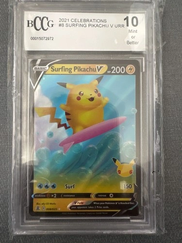 Dive into the world of Pokémon TCG with the Surfing Pikachu V card from the Celebrations set. This English-language card features the beloved Pikachu character, ready to make a splash in your collection. Its standard card size ensures it fits seamlessly with your existing deck. Card number 008/025, Surfing Pikachu V boasts the year 2021 as part of its manufacture details, promising a fresh addition to your gameplay. Whether you're a seasoned player or just starting, this Pokémon card brings a touch of fun to any encounter on the board.