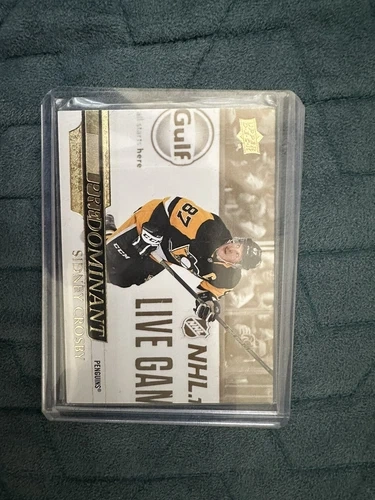 Upper Deck 2020-21 Gold Predominant Sidney Crosby #PR-8 trading card. This rare card features a short print with a gold parallel. Showcases the NHL star Sidney Crosby in his Pittsburgh Penguins jersey. This is an original card, not a reprint. A must-have for any hockey card collector looking to add a unique piece from the 2020-21 season.