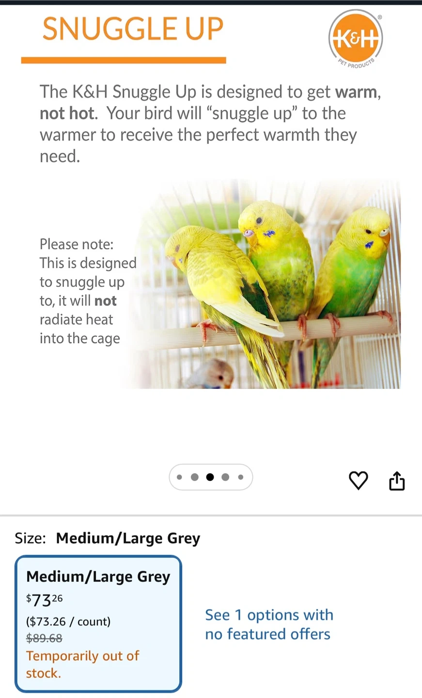 This K&H Pet Products Snuggle Up warmer is designed to provide gentle warmth for birds. It attaches easily to wire cages at the desired position. The unit measures 7 inches by 4 inches