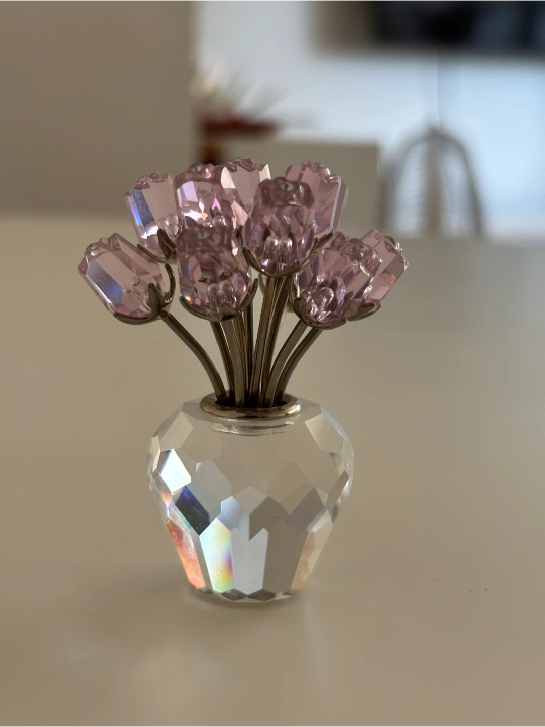 Swarovski Crystal "A Dozen Pink Roses" figurine, produced for the Swarovski "In the Secret Garden" series in the early 2000s! This beautiful sculpture was one of the only Colored Crystal pieces released for the "In the Secret Garden" series. The faceted pink lead crystal Roses are attached to silver-toned stems and were placed in the faceted clear crystal vase.