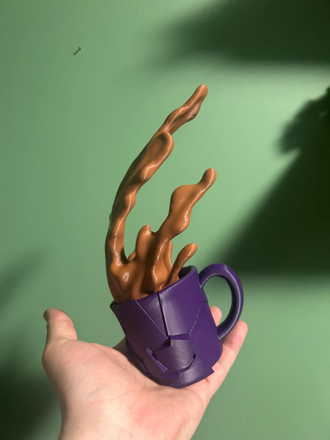 This is a 3D printed decorative item featuring a coffee splash spilling from a purple mug. It's a unique piece that looks like it's frozen in motion. The purple mug has a geometric, segmented design.