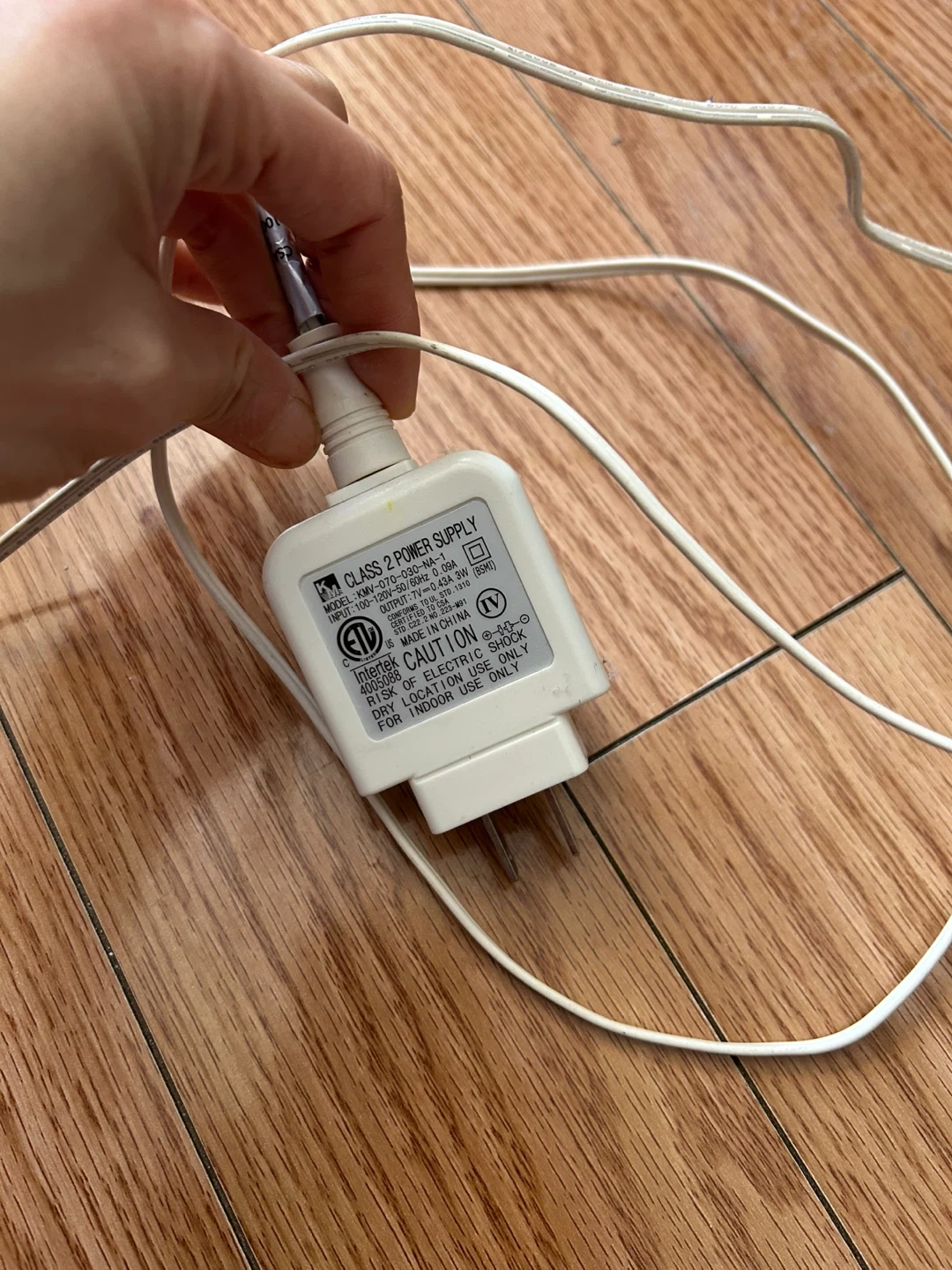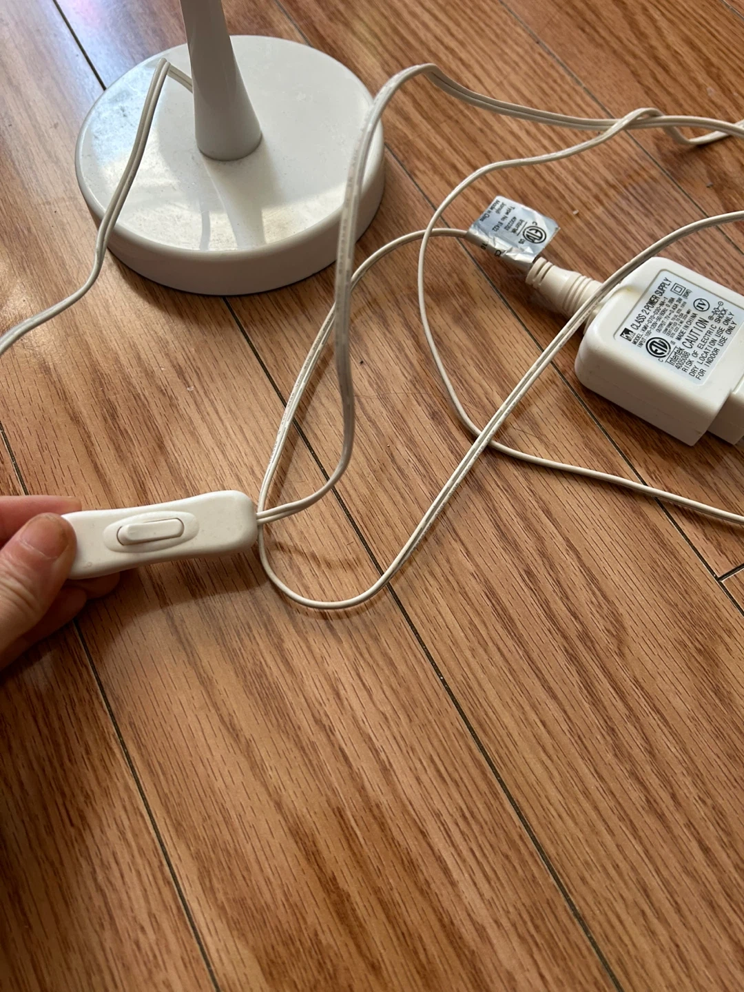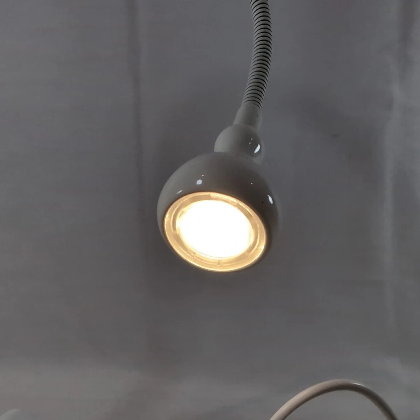 This is a white gooseneck LED desk lamp. It features a flexible neck for adjustable lighting. The lamp includes a power adapter and an inline switch. It's a handy light for reading or working.