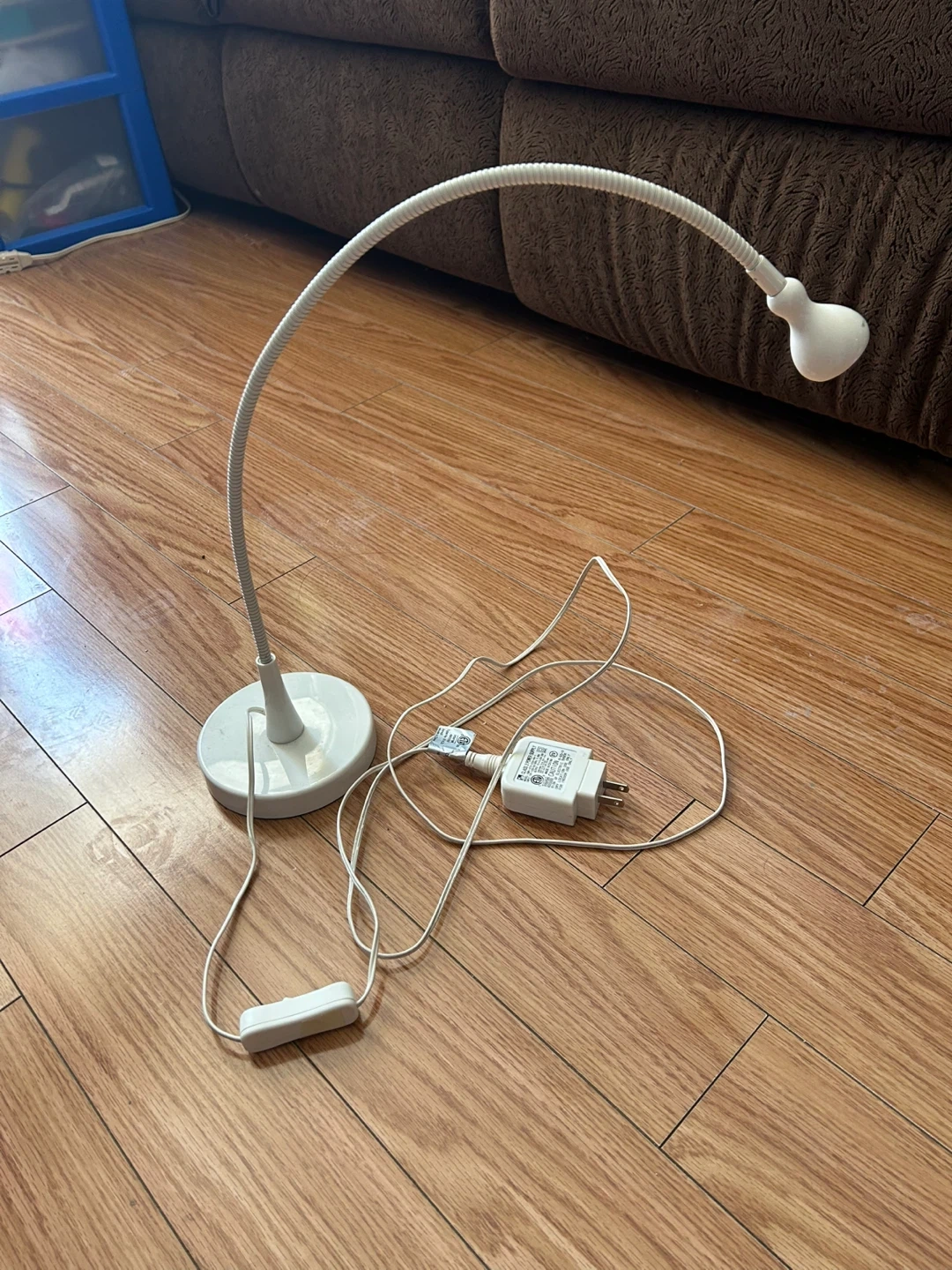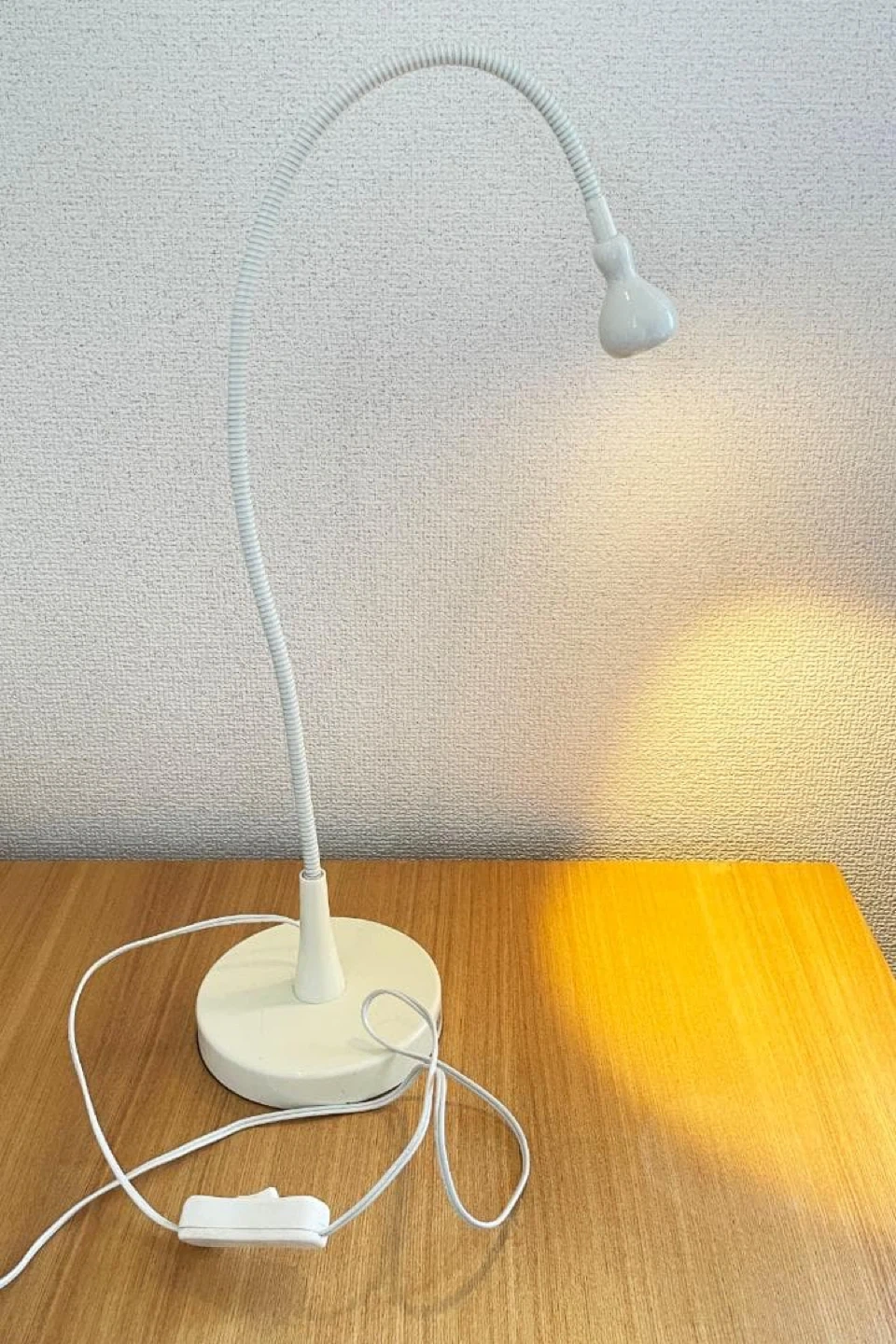 This is a white gooseneck LED desk lamp. It features a flexible neck for adjustable lighting. The lamp includes a power adapter and an inline switch. It's a handy light for reading or working.