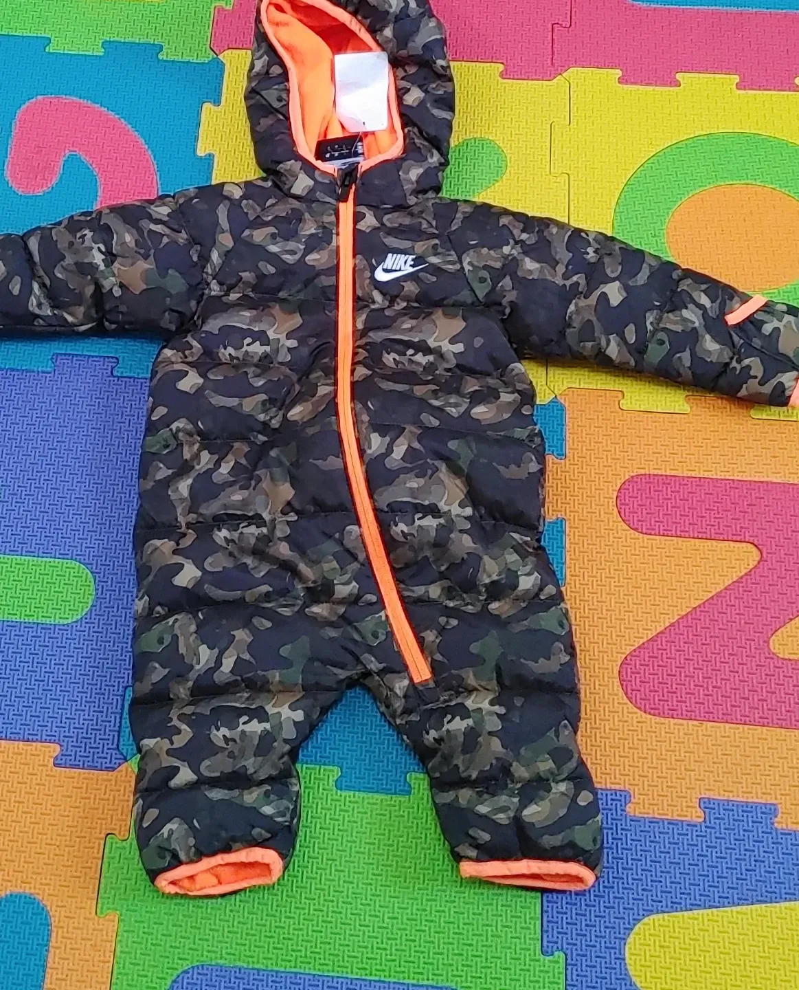 Nike baby snowsuit in a camouflage pattern. It has an orange lining and zipper accents. Great for keeping little ones warm during colder weather!