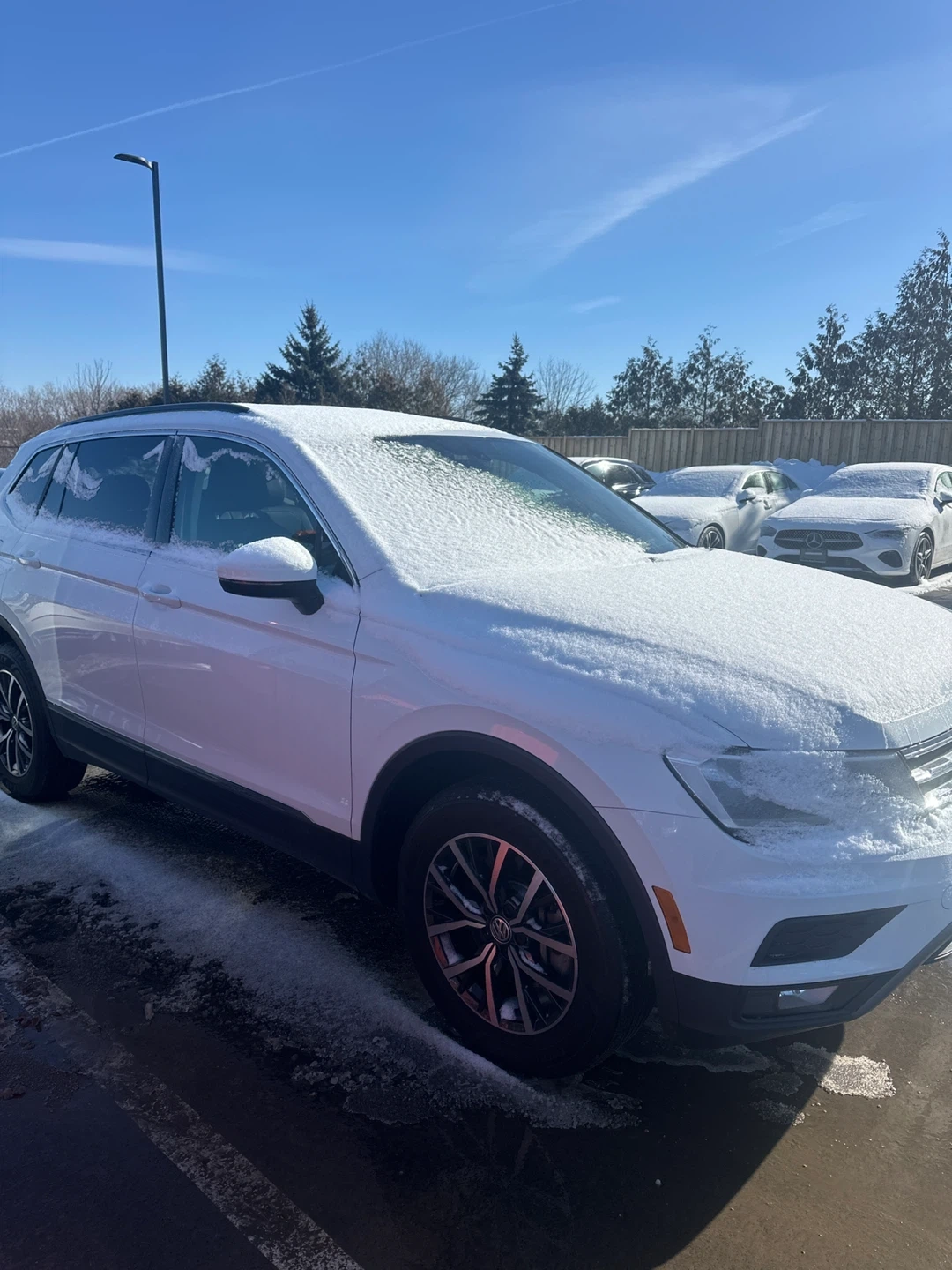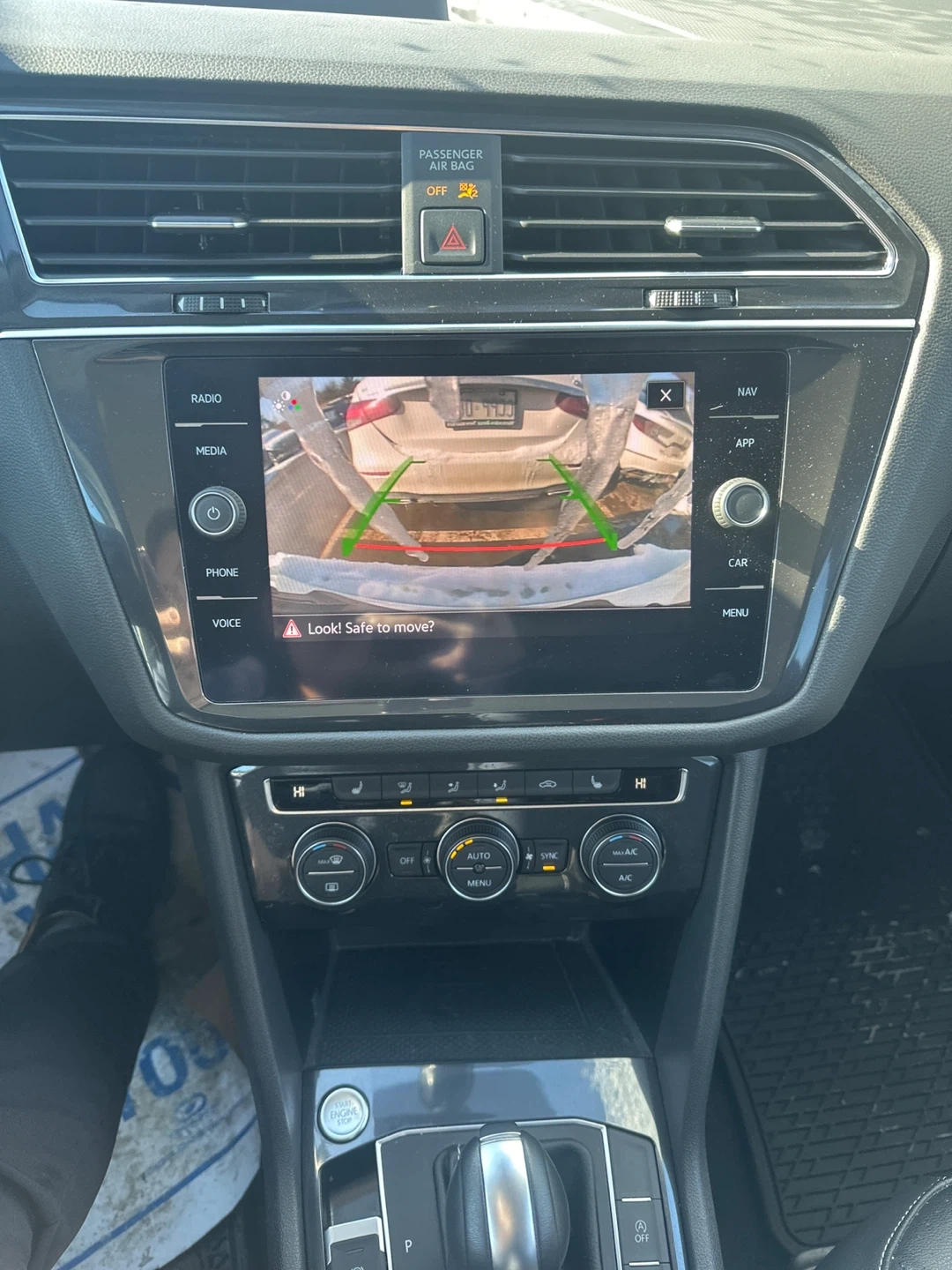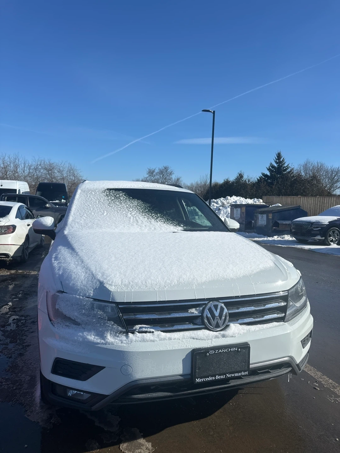 This is a white Volkswagen Tiguan. It has leather heated seats, all wheel drive, alloy wheels, backup camera and blind spot detection. 2.0L turbo engine.
