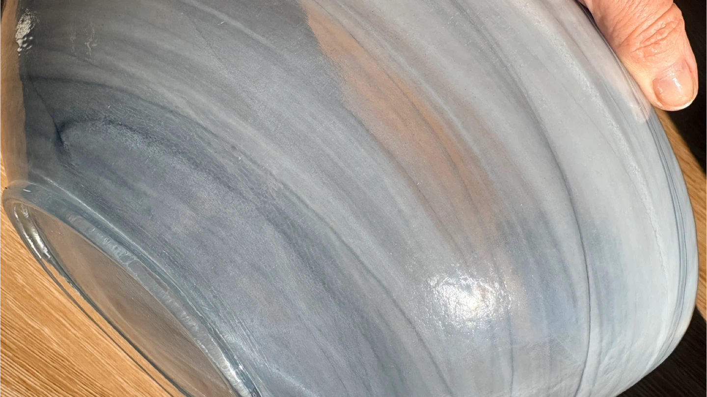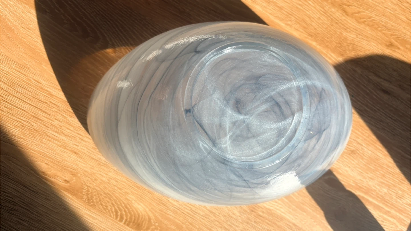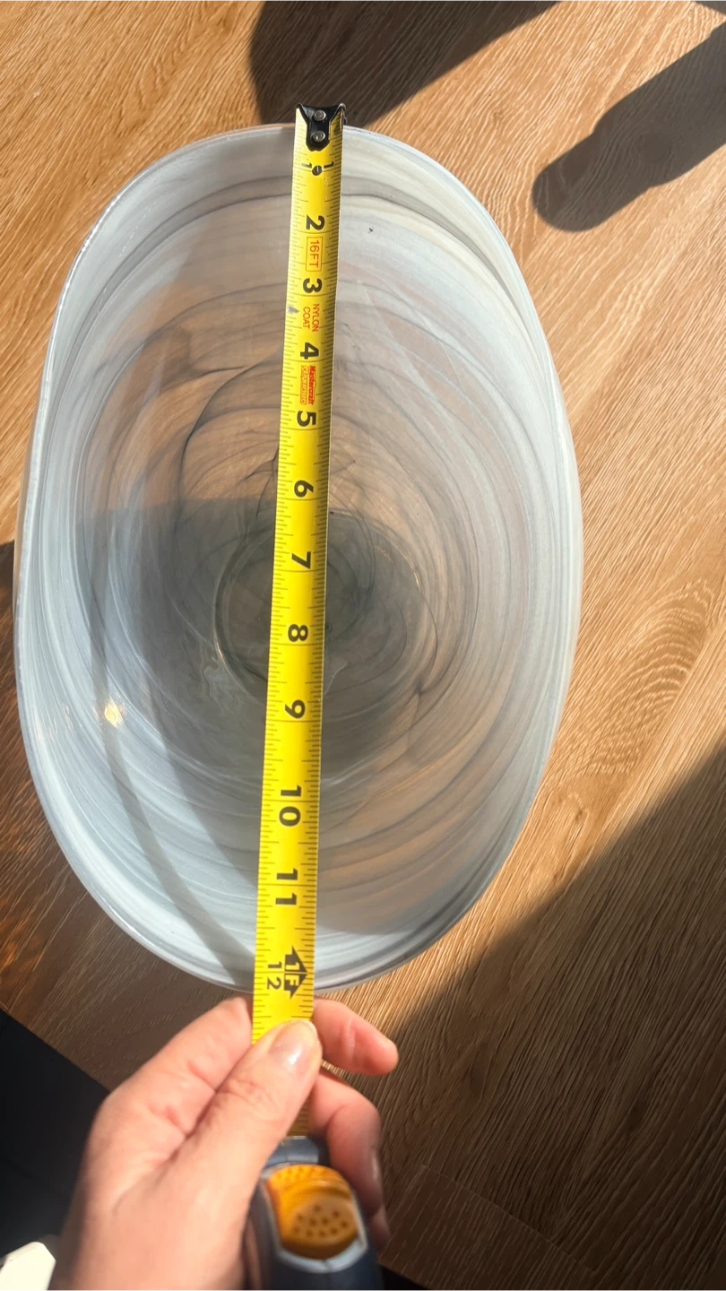 Beautiful decorative bowl with a unique blue and white swirl pattern. It's made of glass and measures approximately 11 inches wide. This piece adds a touch of elegance to any room!