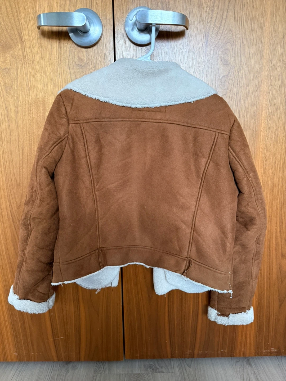 This Jennyfer jacket is a stylish brown faux suede with a cozy sherpa lining. It's a size medium, perfect for keeping warm. This outerwear piece features a classic biker style with zippered accents.