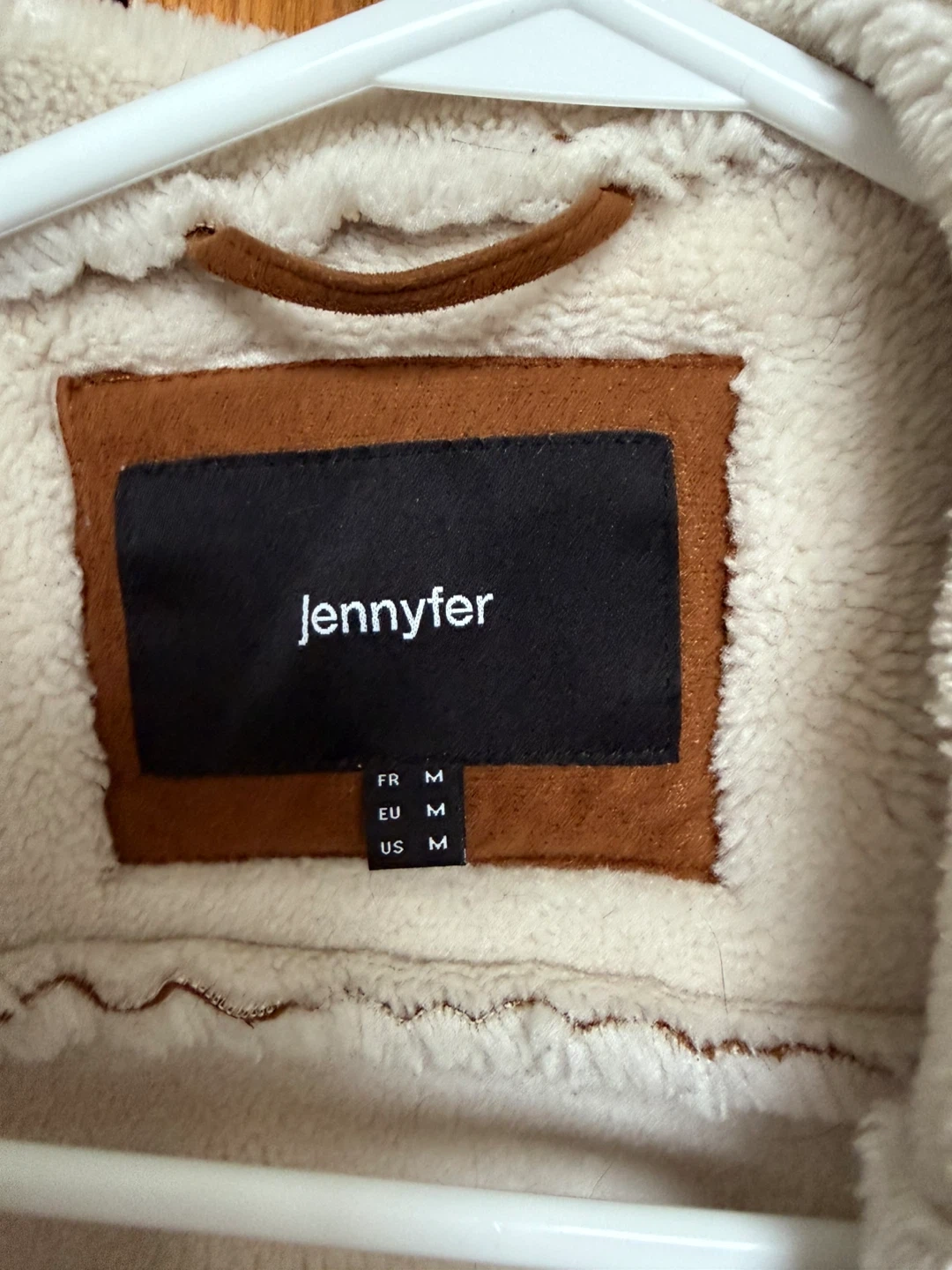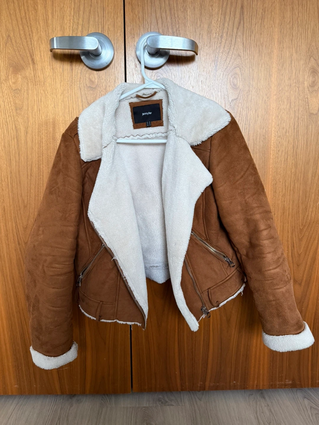 This Jennyfer jacket is a stylish brown faux suede with a cozy sherpa lining. It's a size medium, perfect for keeping warm. This outerwear piece features a classic biker style with zippered accents.