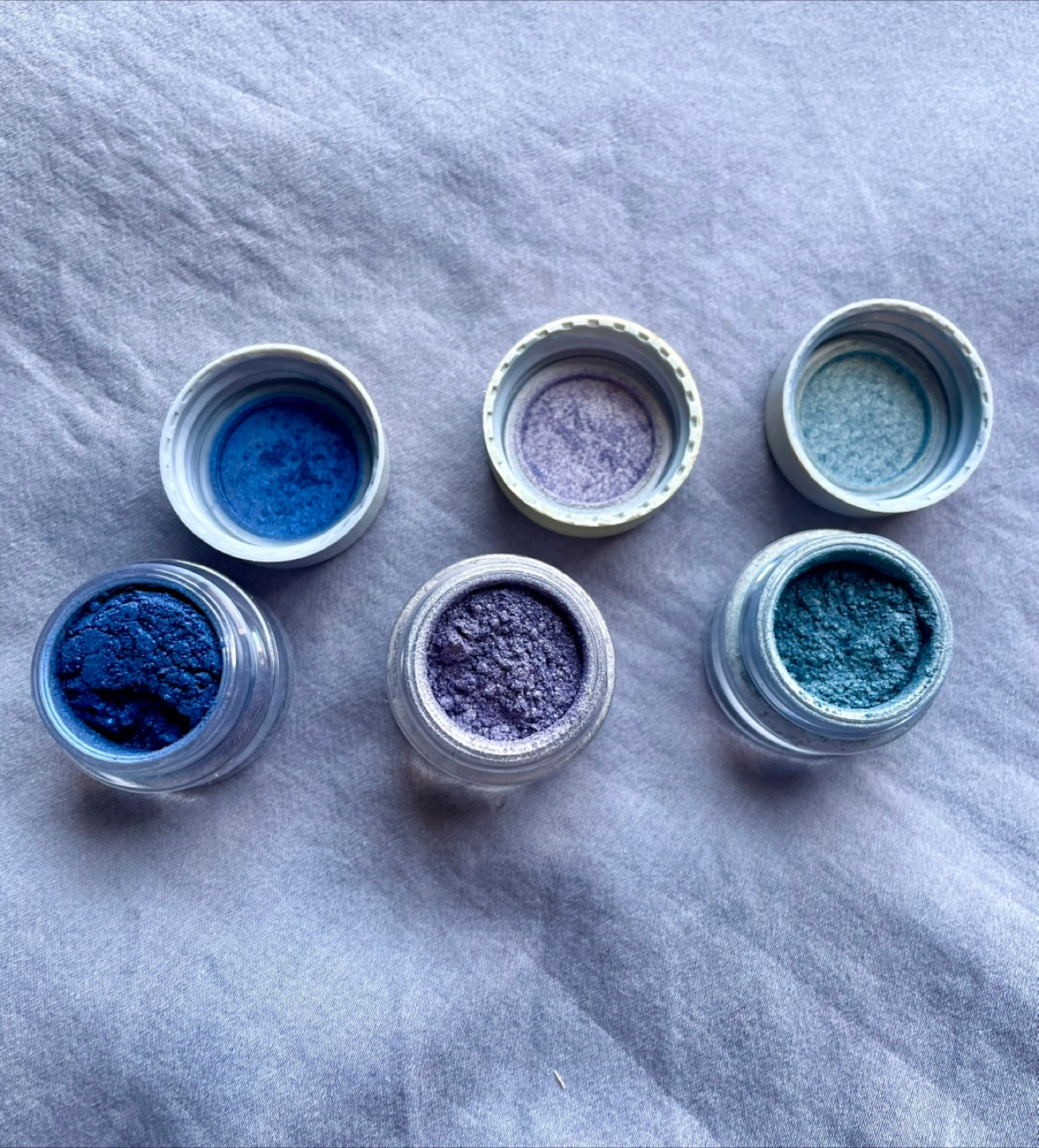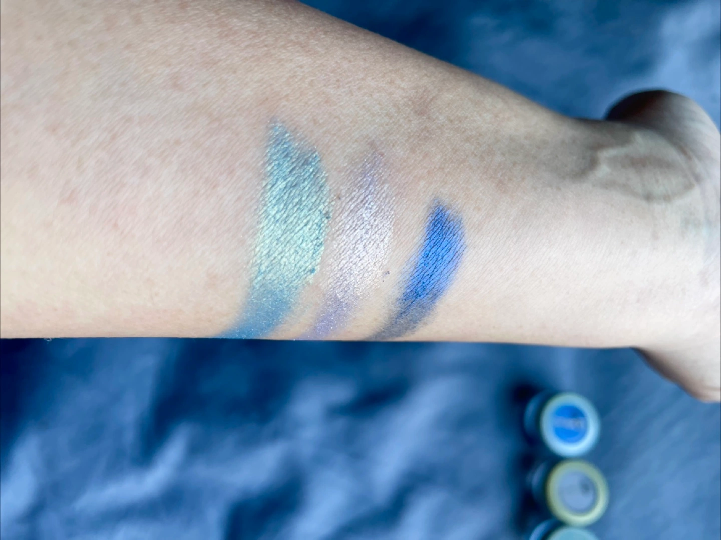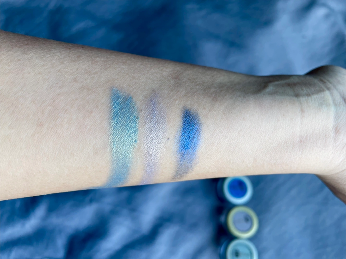 ✨Photos were swipes with clean finger on forearm dry. When applied with a wet brush these look like liquid shadows. There is no sparkle, powder is extremely fine.