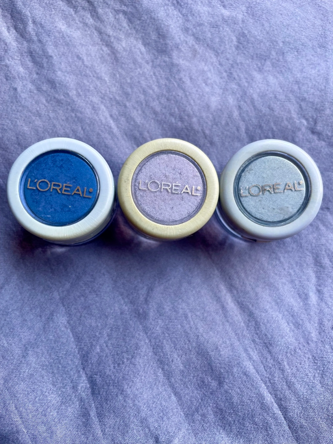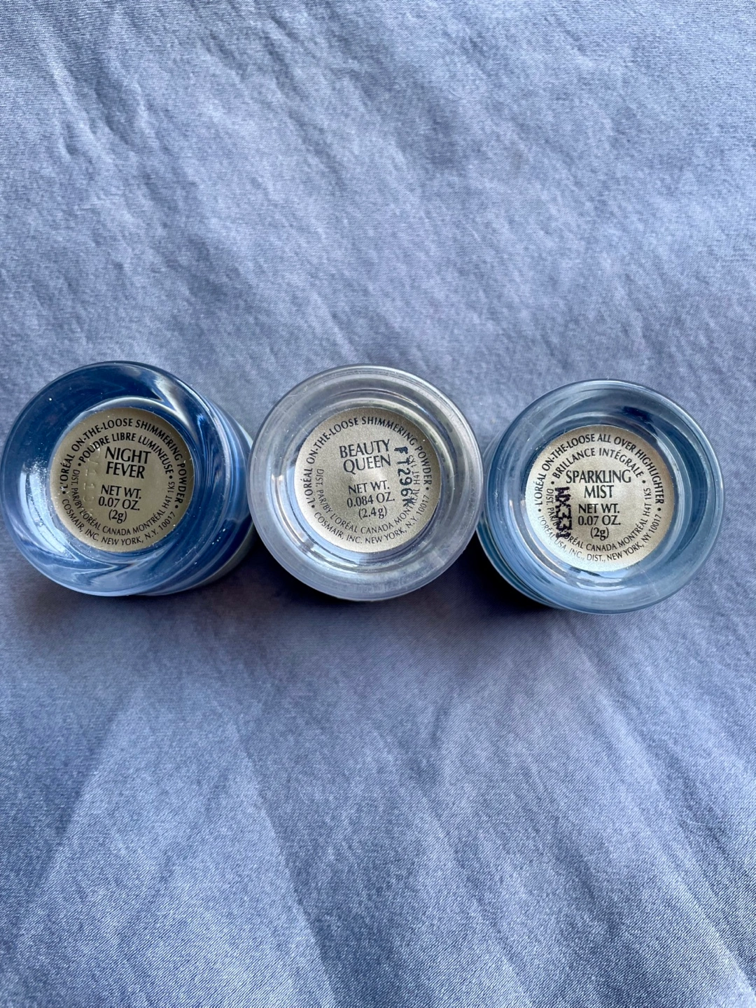 Three L'Oréal loose shimmering powder eyeshadows. Includes shades 'Night Fever' (blue), 'Beauty Queen' (lavender), and 'Sparkling Mist' (light green). Each pot contains 0.07 oz. (2g) of product.