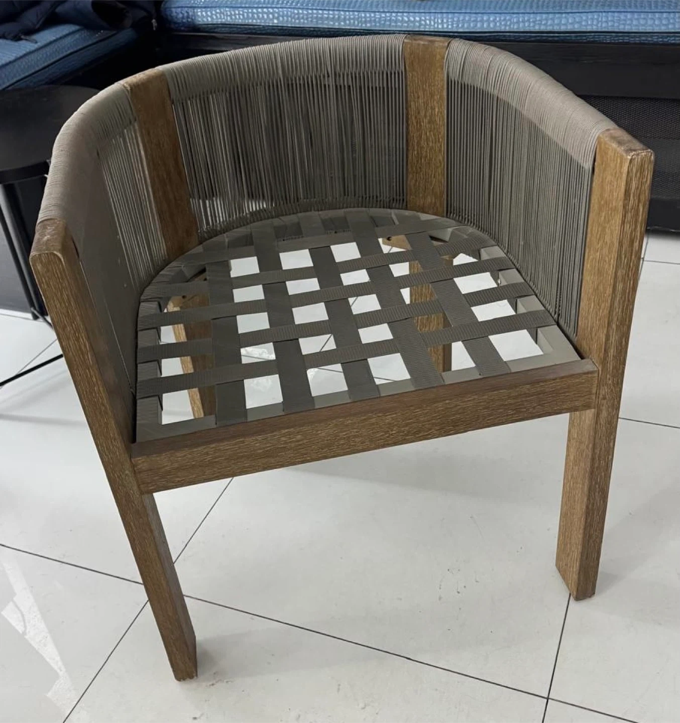 Wooden accent chair featuring a unique rope weave seat and back. The frame is made of a warm-toned wood, complemented by grey rope details. Its construction provides a sturdy and stylish seating option.