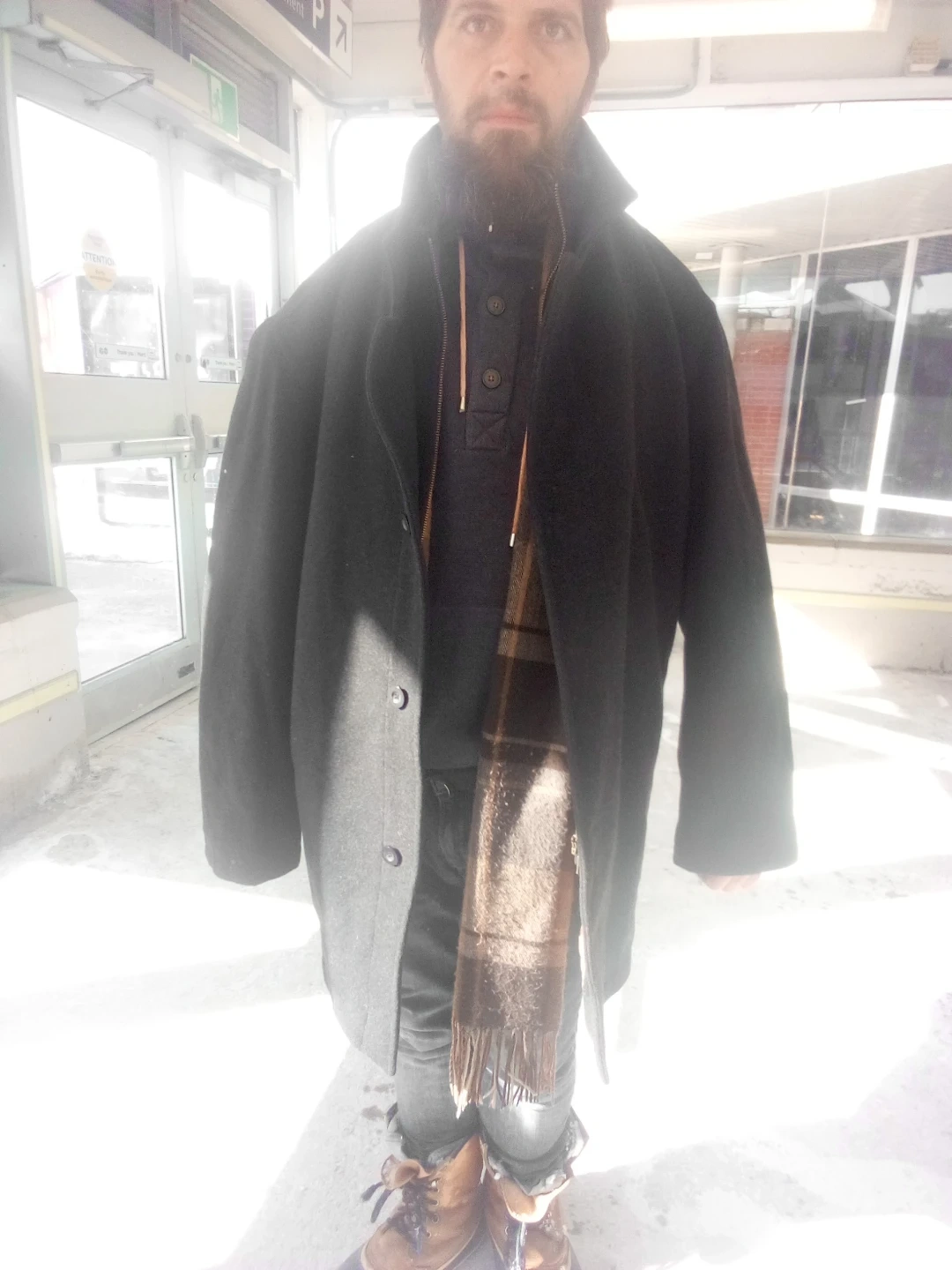 Warm peacoat made from a wool blend. Features a button-up front and a classic collar. Includes a quilted lining for extra insulation. Perfect for keeping cozy on colder days!