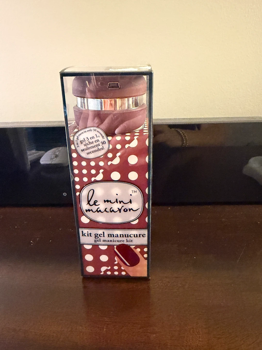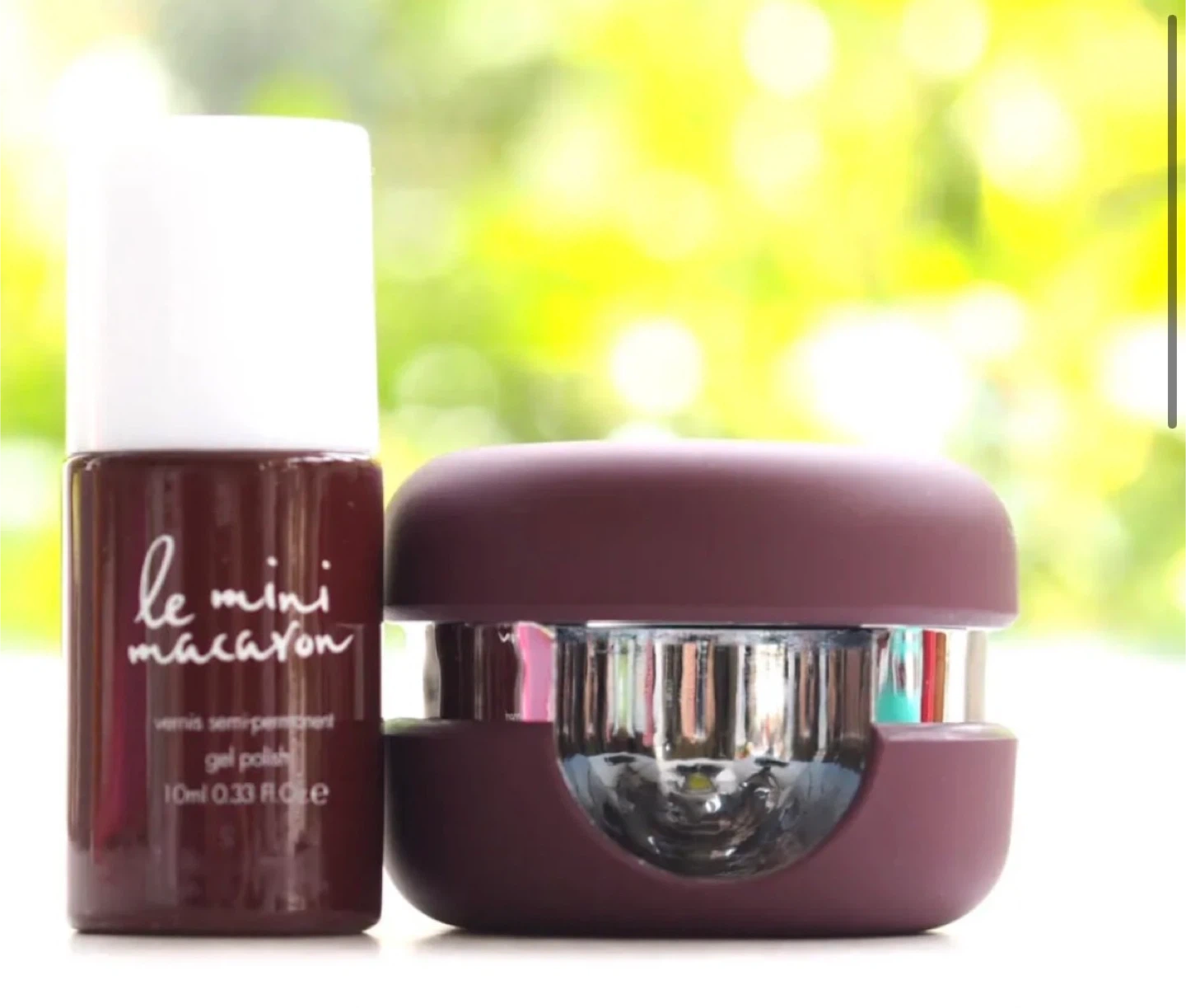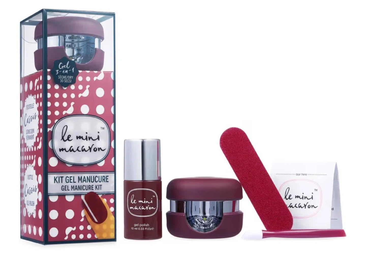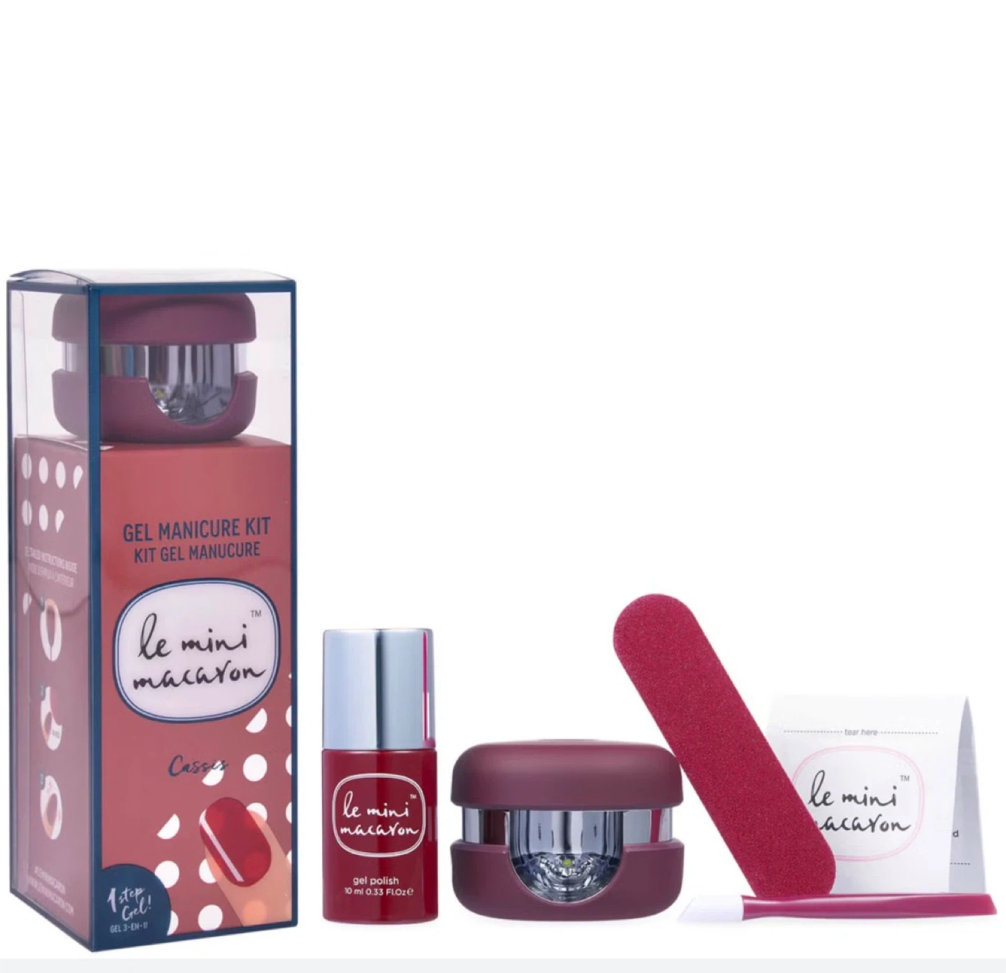 This Le Mini Macaron gel manicure kit comes with a mini LED lamp and a bottle of Cassis gel polish. It also includes a nail file and instructions. Perfect for at-home gel manicures!