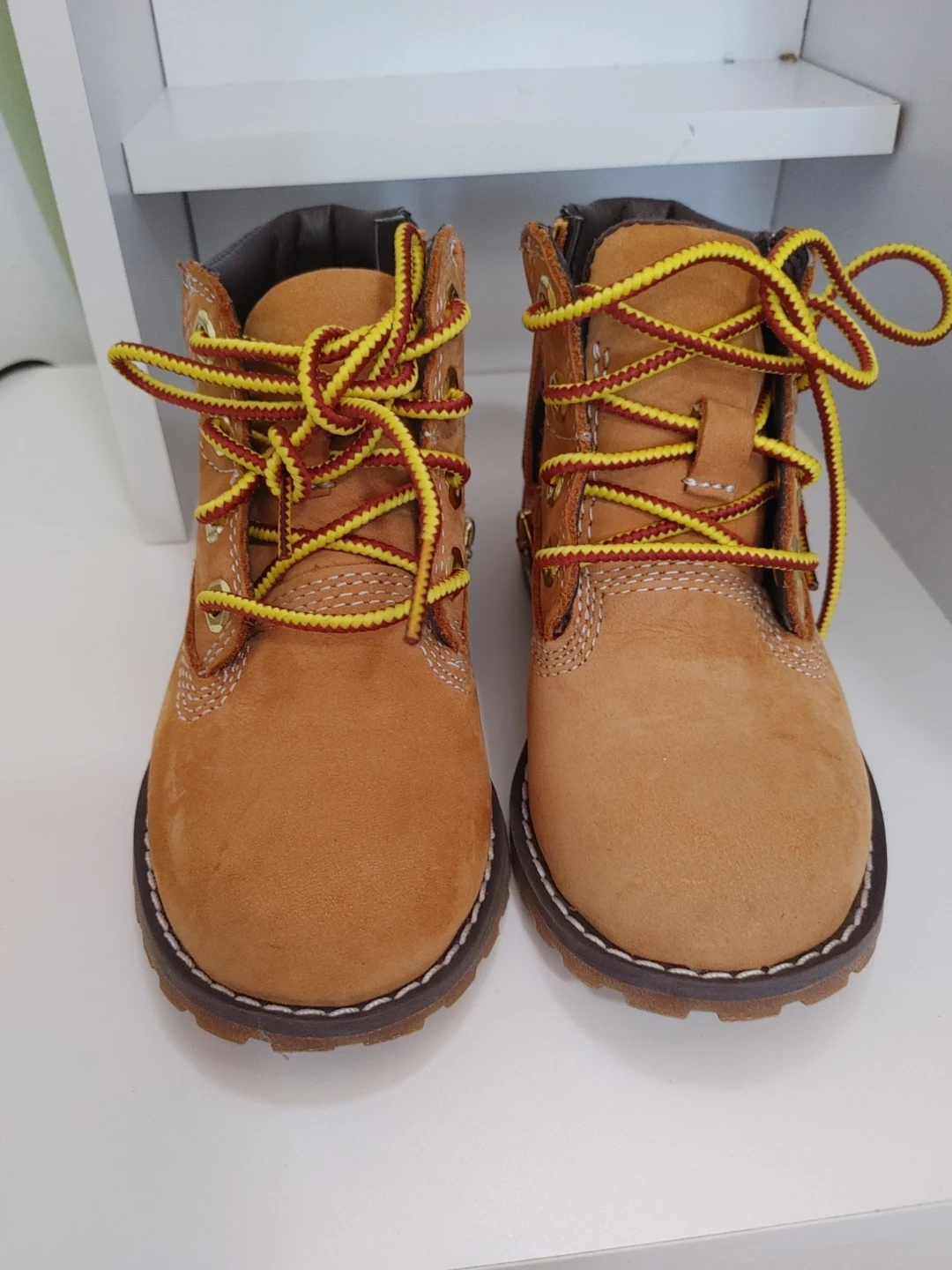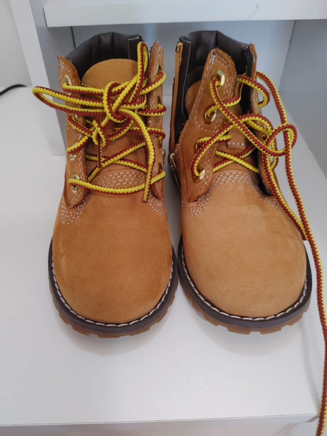 Timberland youth boots in tan nubuck leather with red and yellow laces. These boots have a side zipper for easy on and off. Includes the original box.