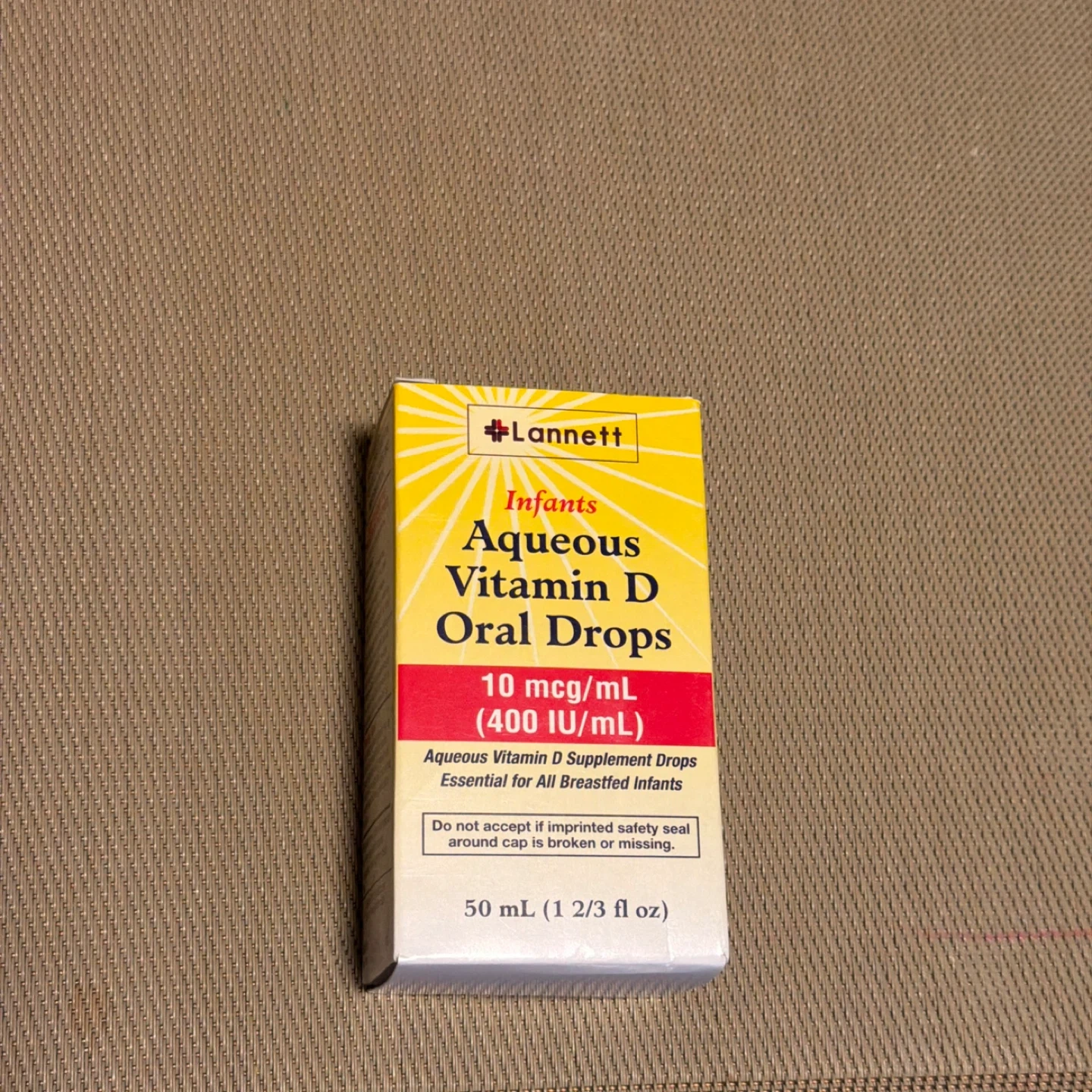 Lannett Infants Aqueous Vitamin D Oral Drops are essential for all breastfed infants. Each bottle contains 50 mL (1 2/3 fl oz) of the supplement drops. The expiration date is 2026/10.