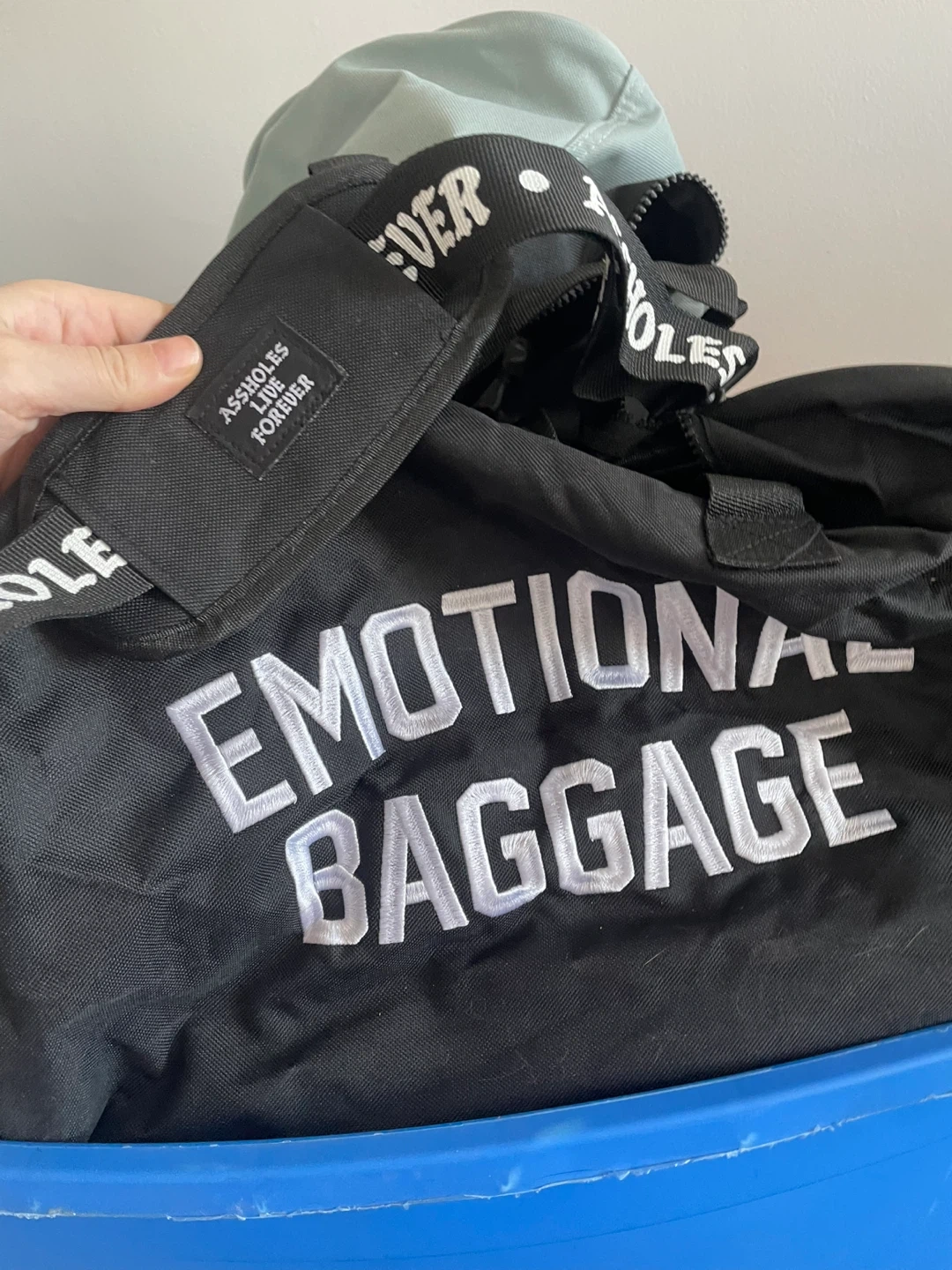 Duffel bag with "Assholes Live Forever" embroidered on it. Also features "Emotional Baggage" text on a black bag. Durable fabric construction. Strap with "Assholes Live Forever" text included.