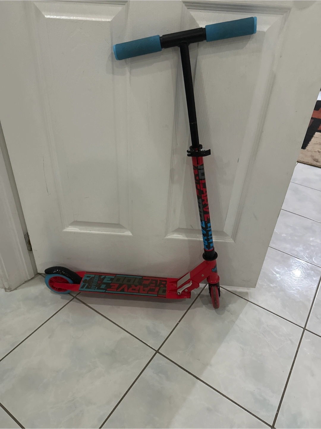 This scooter is red with blue grips and has "FREESTYLE CARVE" printed on the deck. It's built for riding and carving. Seems like a fun way to get around!