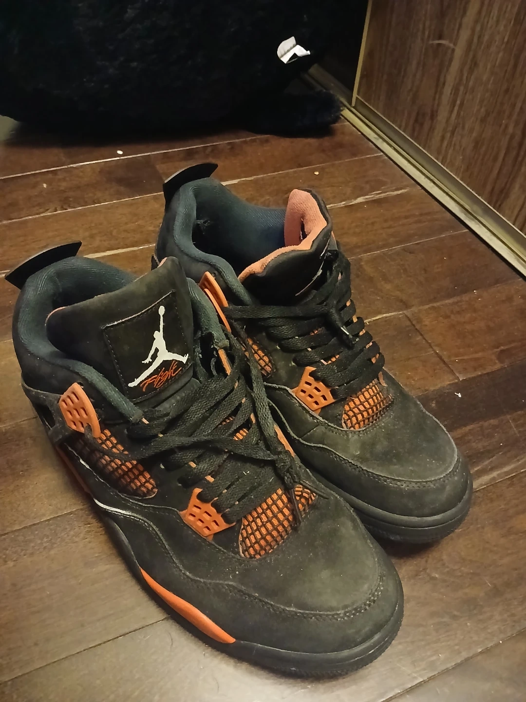 These Air Jordan 4s come in a classic "Bred" colourway. They feature a black suede upper with red and grey accents. This iconic silhouette is a must-have for any sneaker collection.