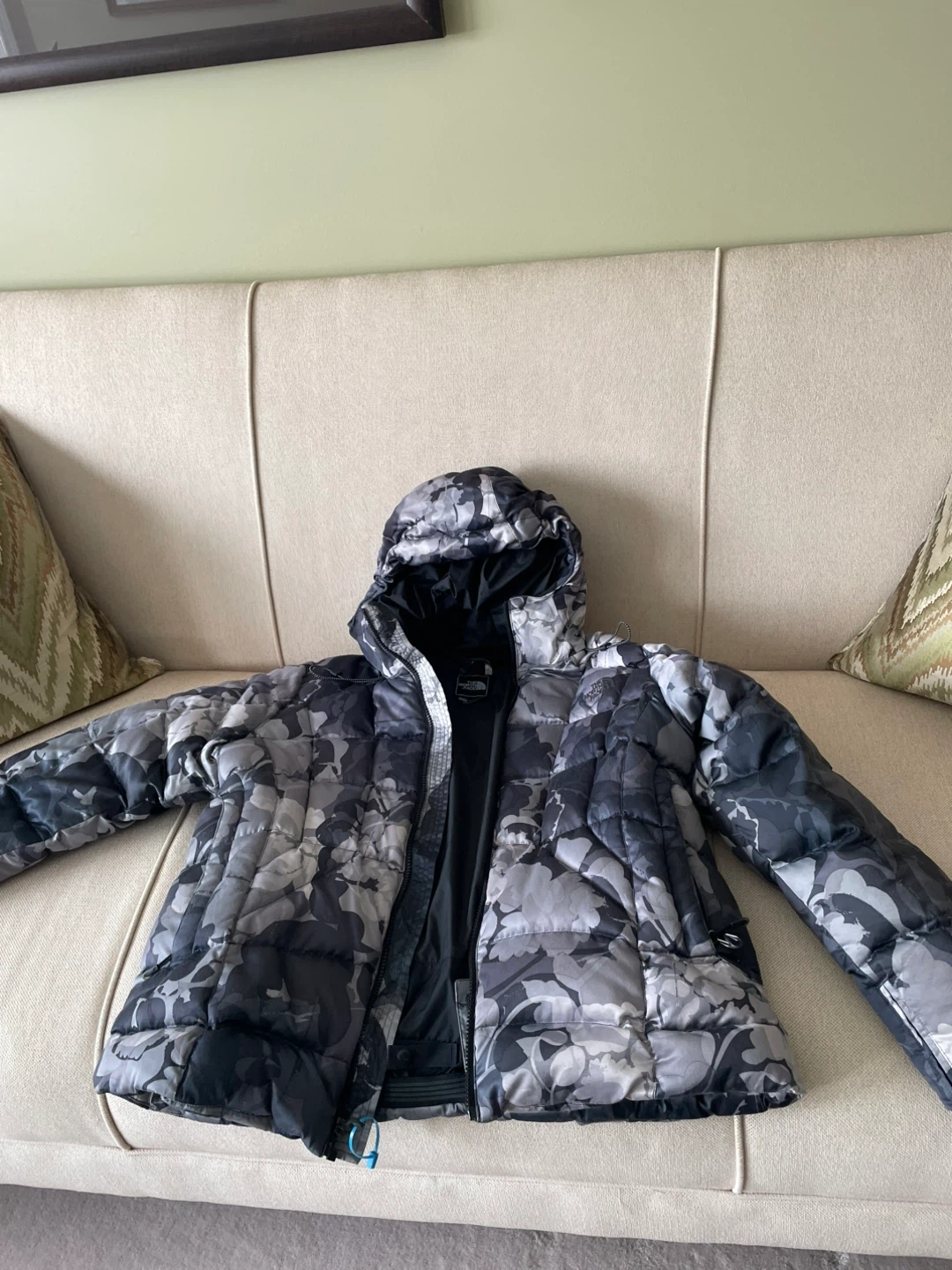This is a women's puffer jacket from The North Face. It's an XL/TG size with a grey and black camouflage floral print. Fully insulated and has a hood.