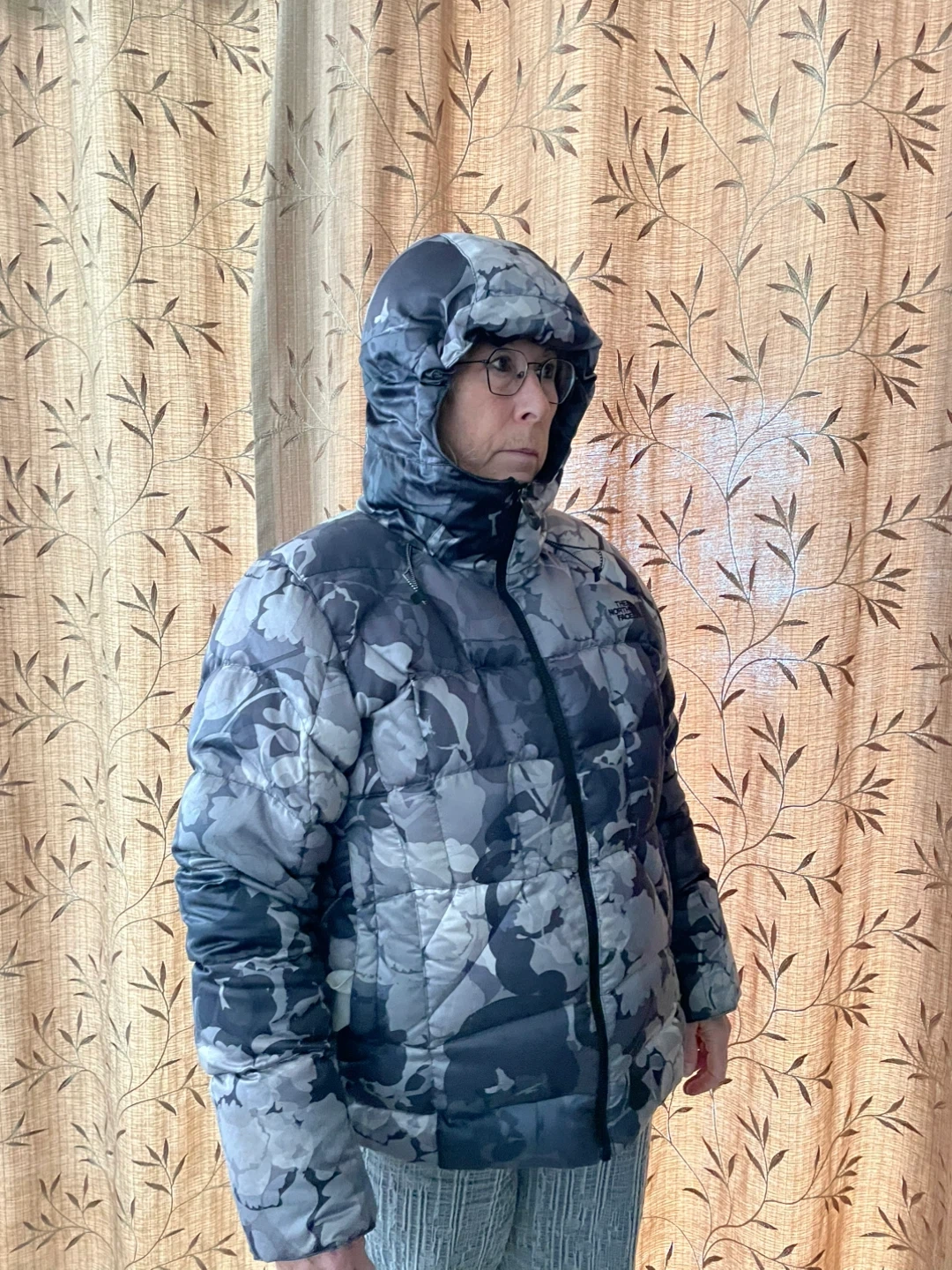 This is a women's puffer jacket from The North Face. It's an XL/TG size with a grey and black camouflage floral print. Fully insulated and has a hood.