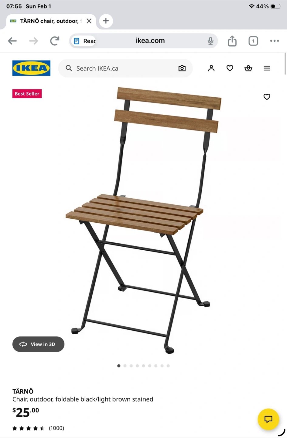 This IKEA TÄRNÖ chair is designed for outdoor use and features a foldable black frame with a light brown stained seat and back. It's made with a metal frame and wooden slats for durability. Perfect for patios or balconies!