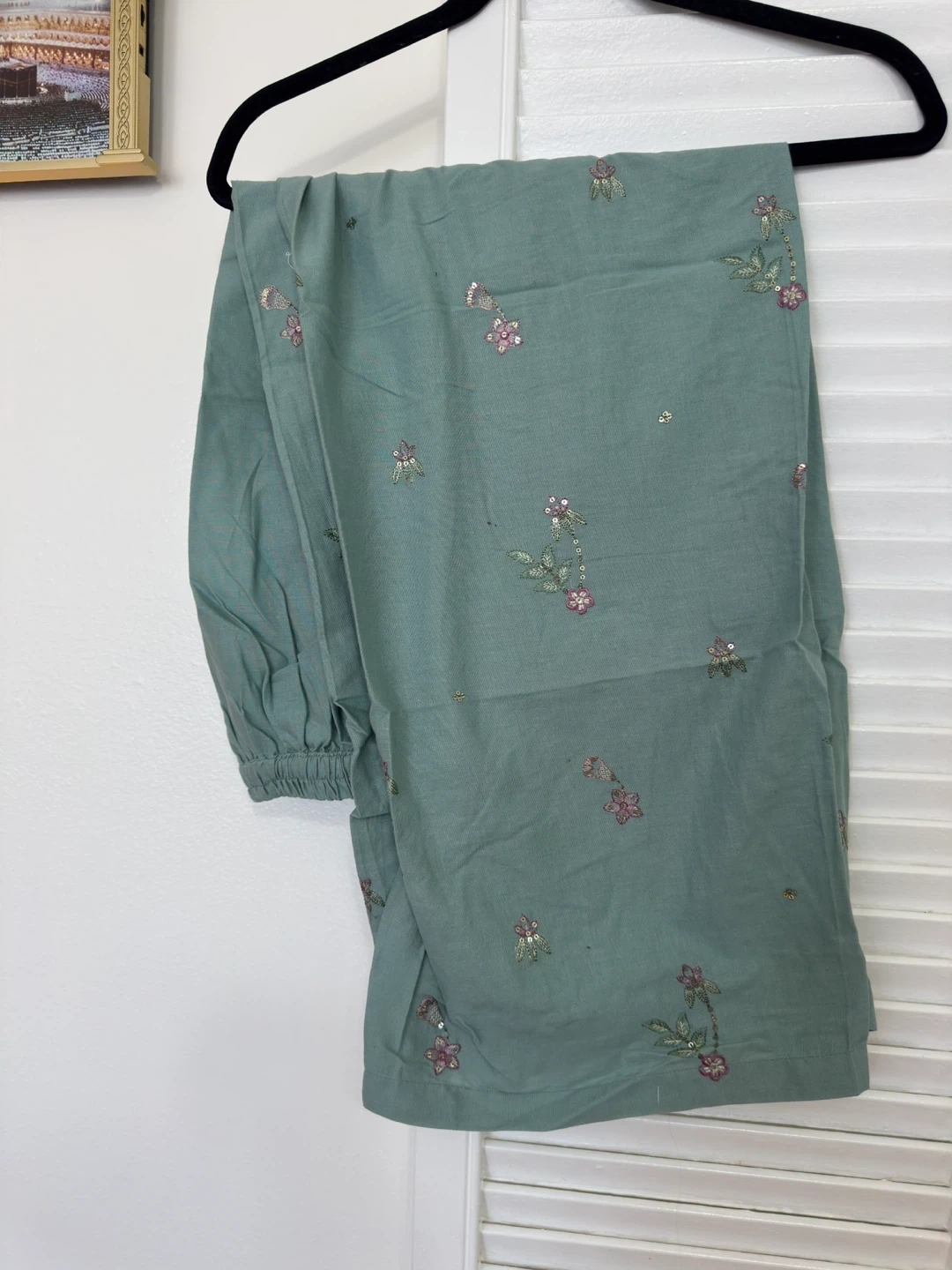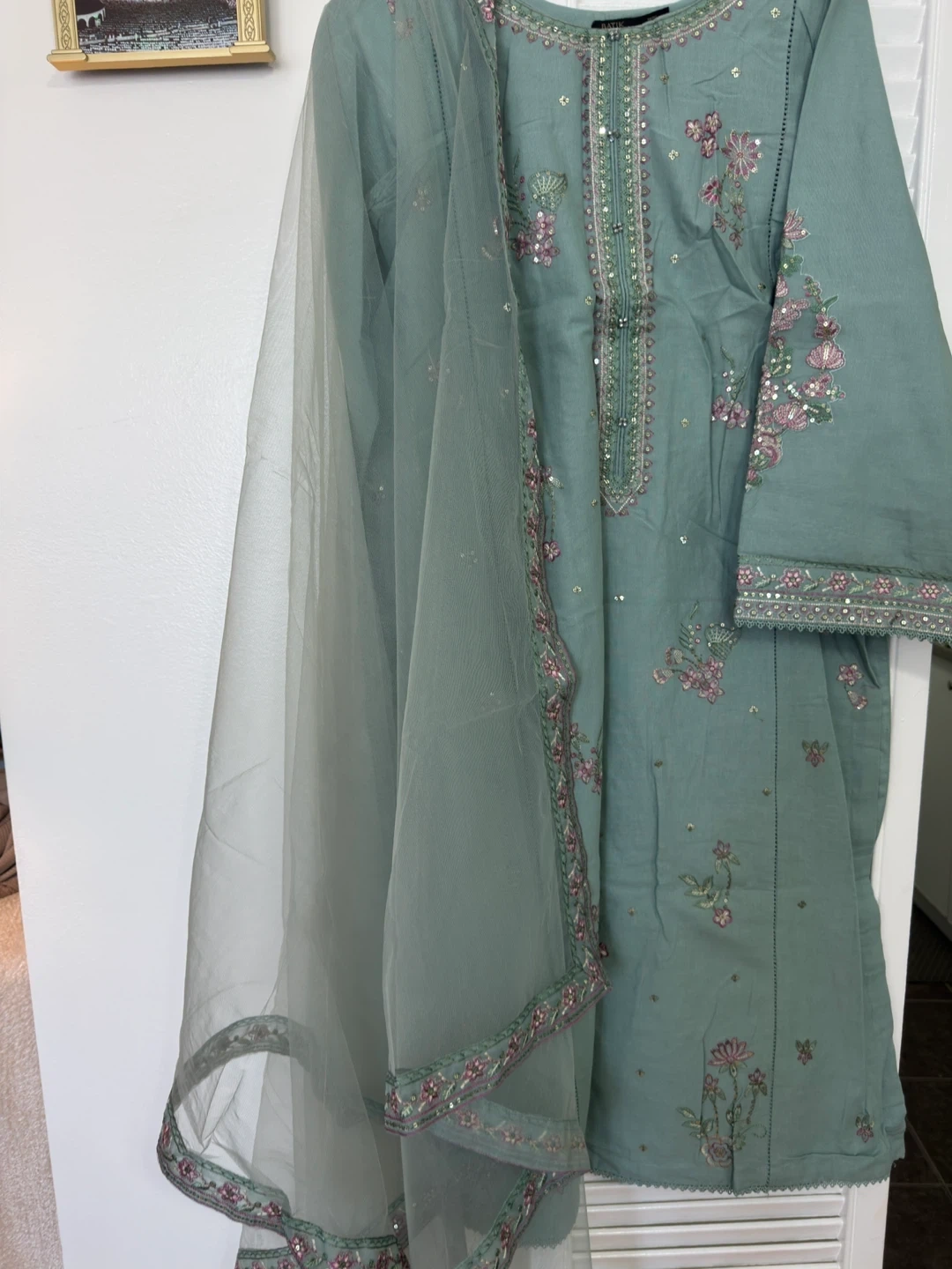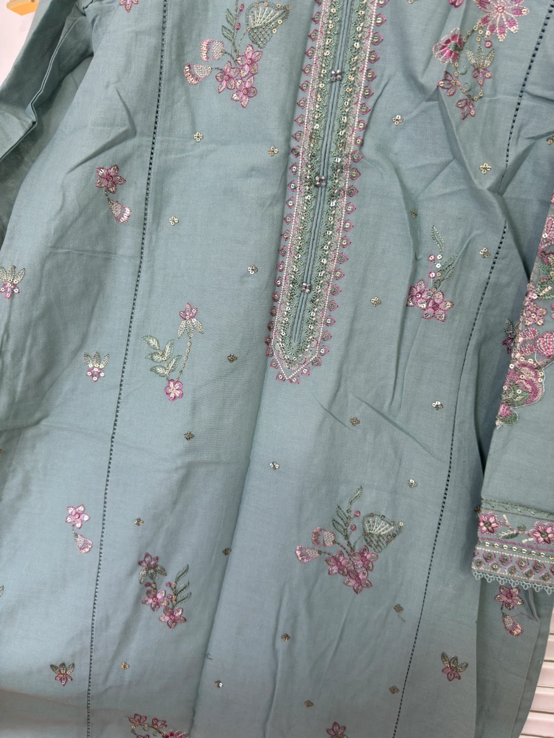 Beautiful teal embroidered khaddar suit with a matching sheer dupatta. Features intricate floral embroidery and sequin details. Perfect for casual wear or events!