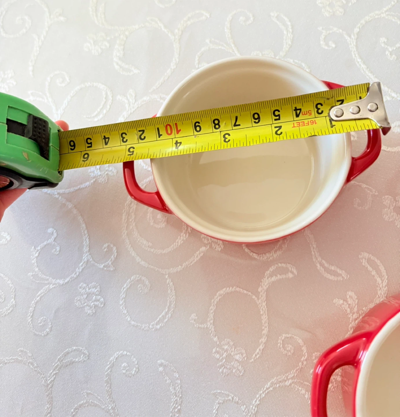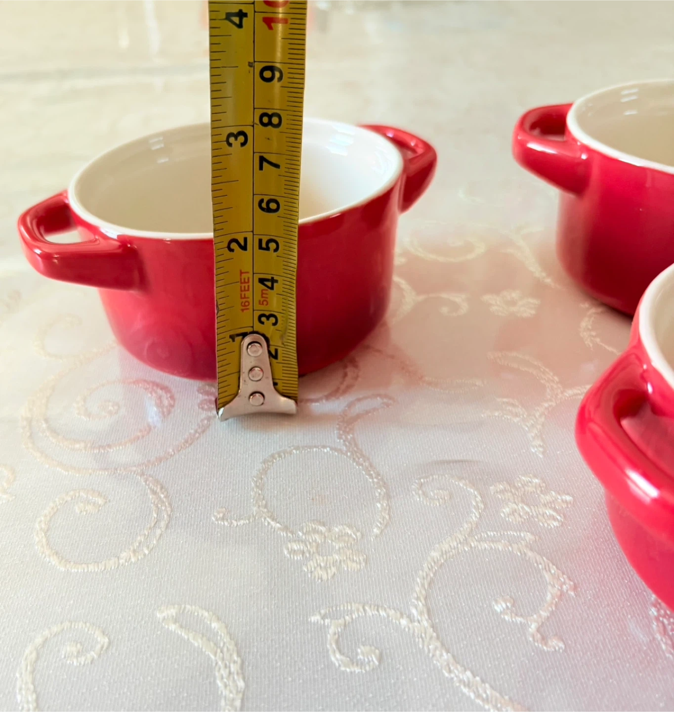 This set includes three red ceramic ramekins. They're perfect for individual servings of desserts or dips. Each ramekin has two small handles for easy carrying.