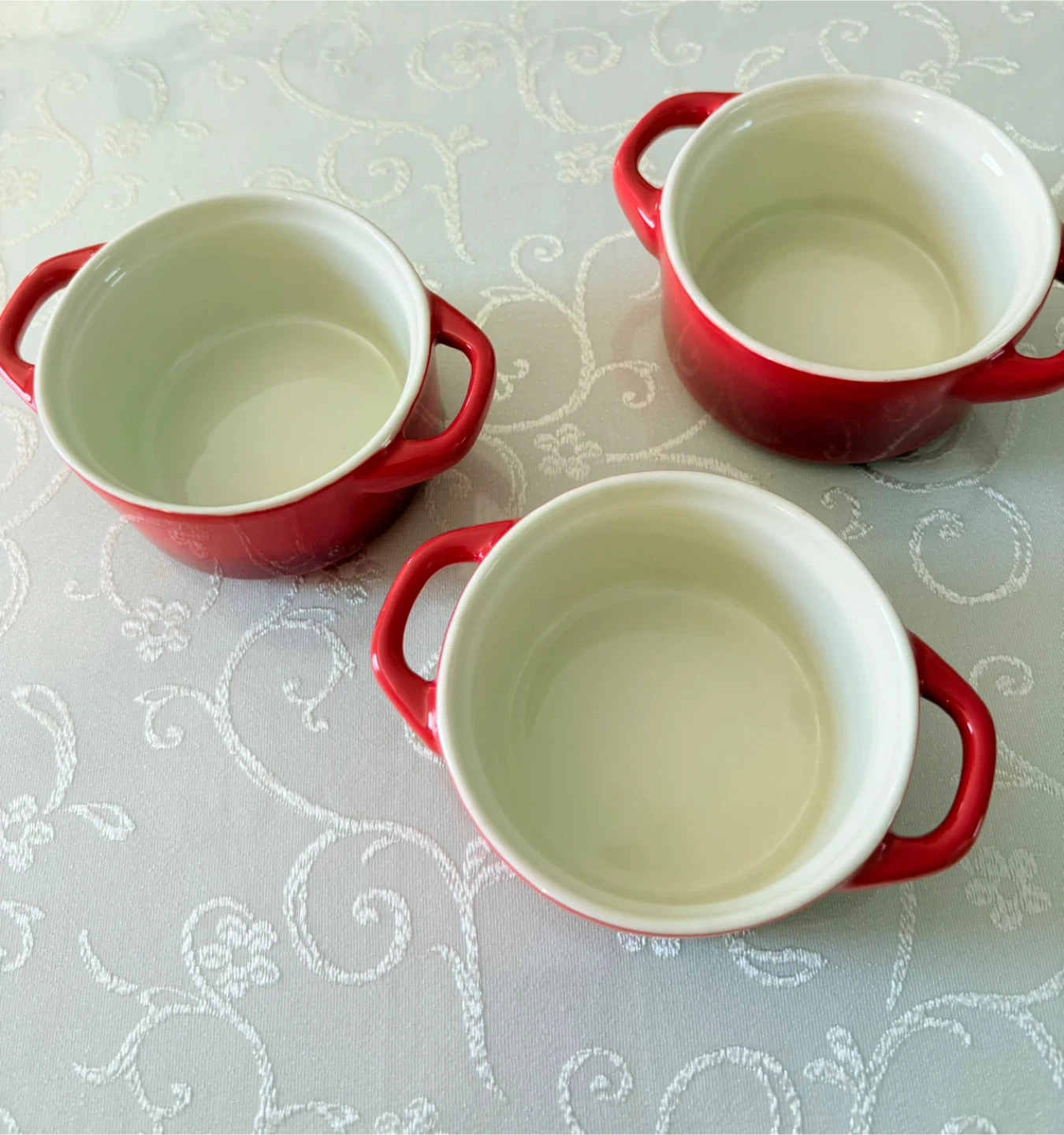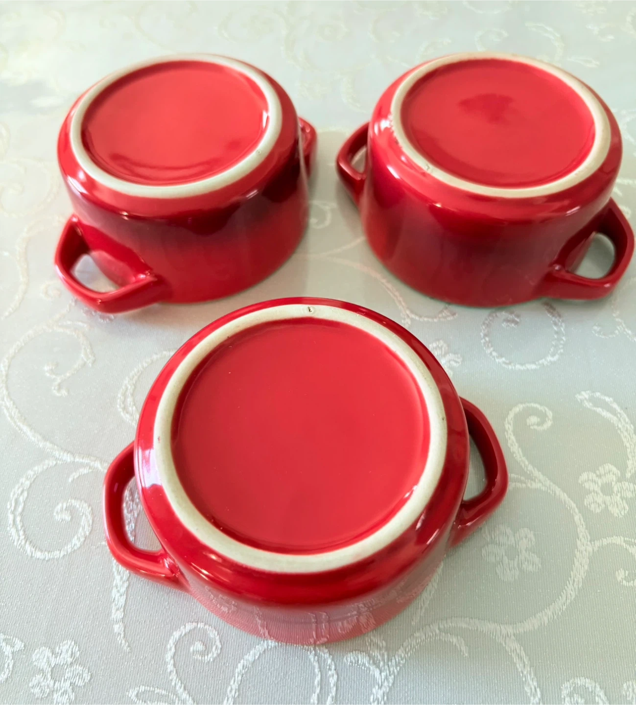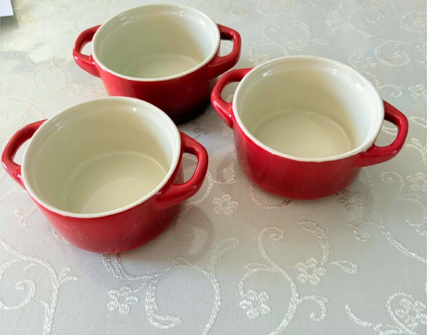 This set includes three red ceramic ramekins. They're perfect for individual servings of desserts or dips. Each ramekin has two small handles for easy carrying.