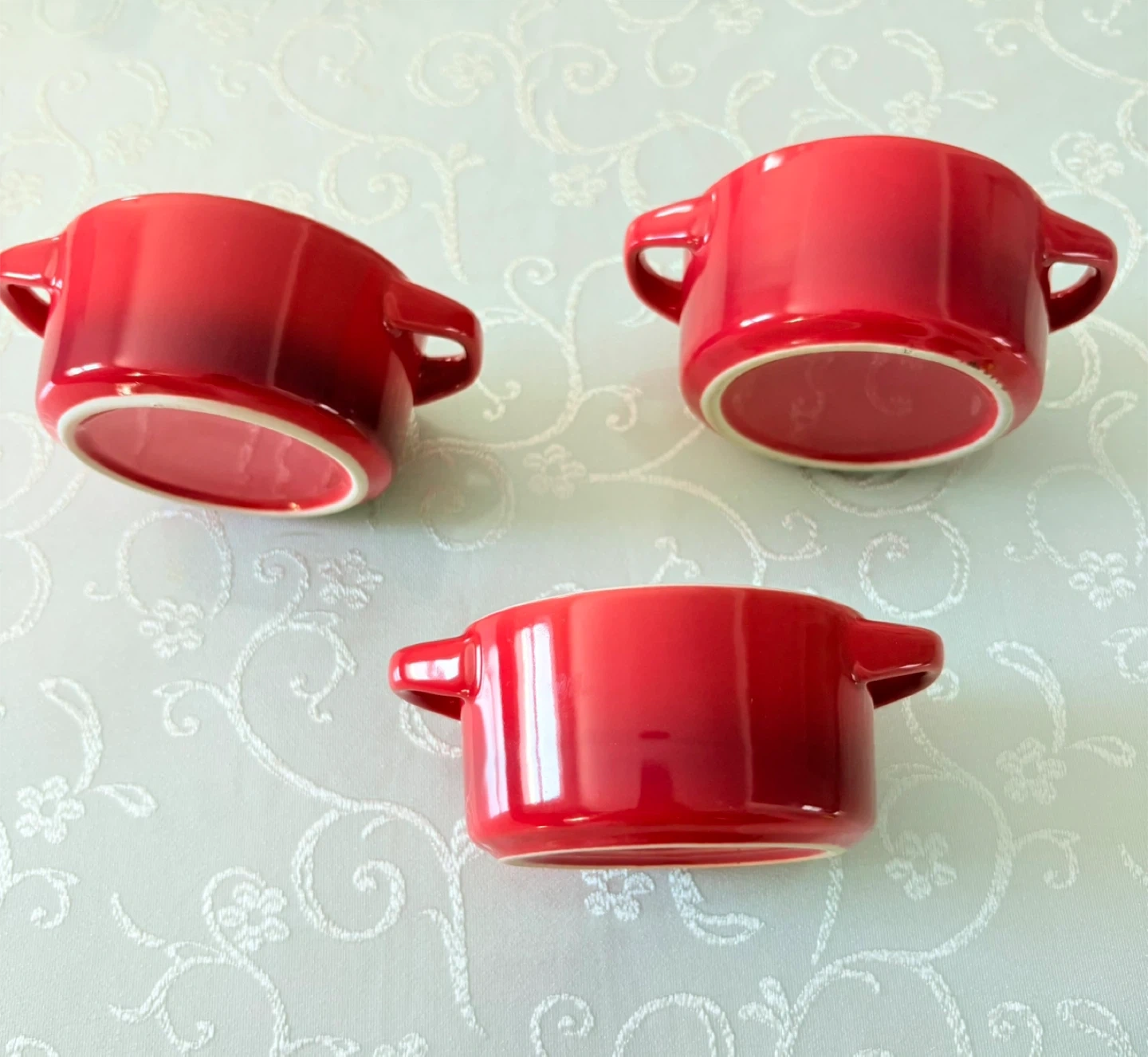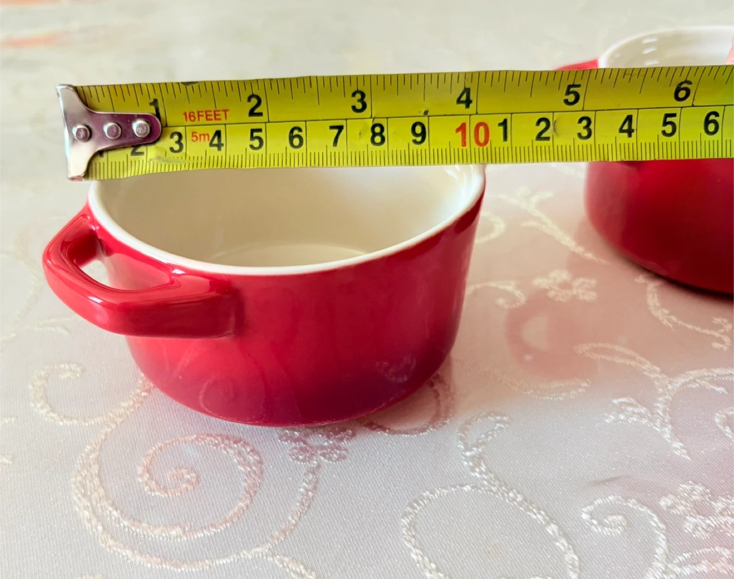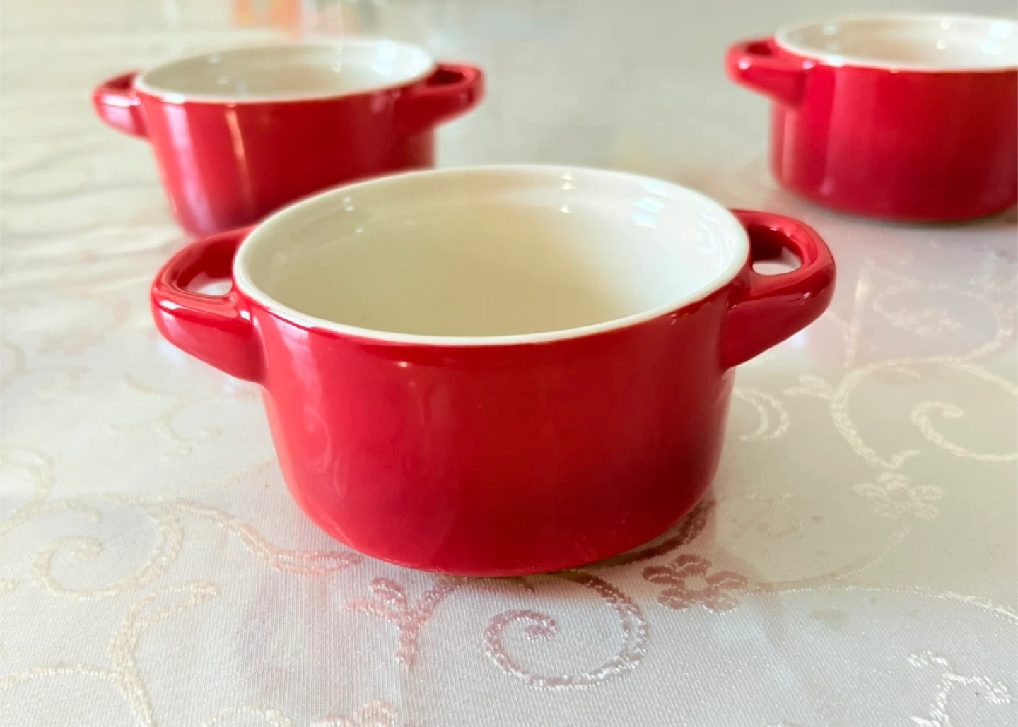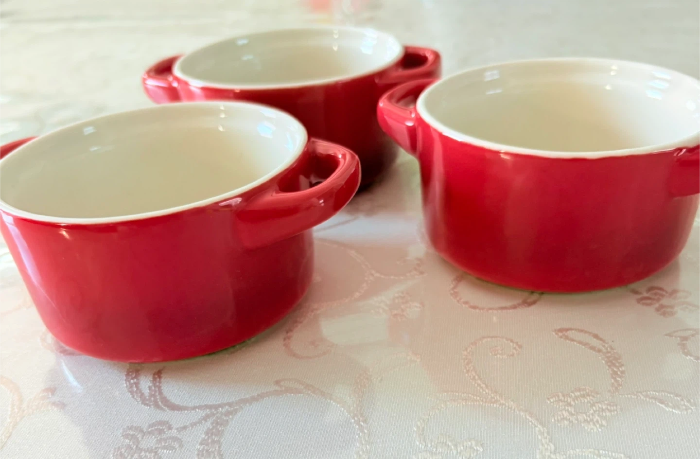 This set includes three red ceramic ramekins. They're perfect for individual servings of desserts or dips. Each ramekin has two small handles for easy carrying.