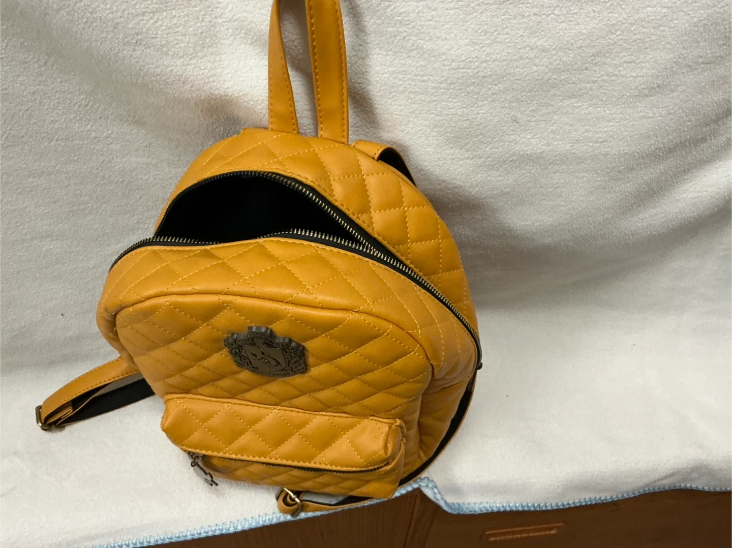 This yellow quilted mini backpack features the Hufflepuff crest. It has a front zipper pocket with a cute charm. It's made of faux leather.